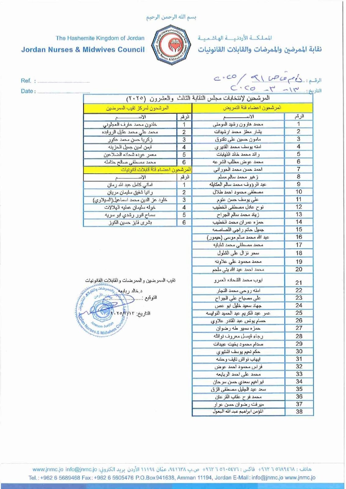 عمون - ترشح ستة ممرضين للمنافسة على مركز نقيب الممرضين في انتخابات نقابة الممرضين والممرضات والقابلات القانونيات التي ستجرى في 18 نيسان المقبل، وذلك مع إغلاق باب الترشح لانتخابات النقابة.