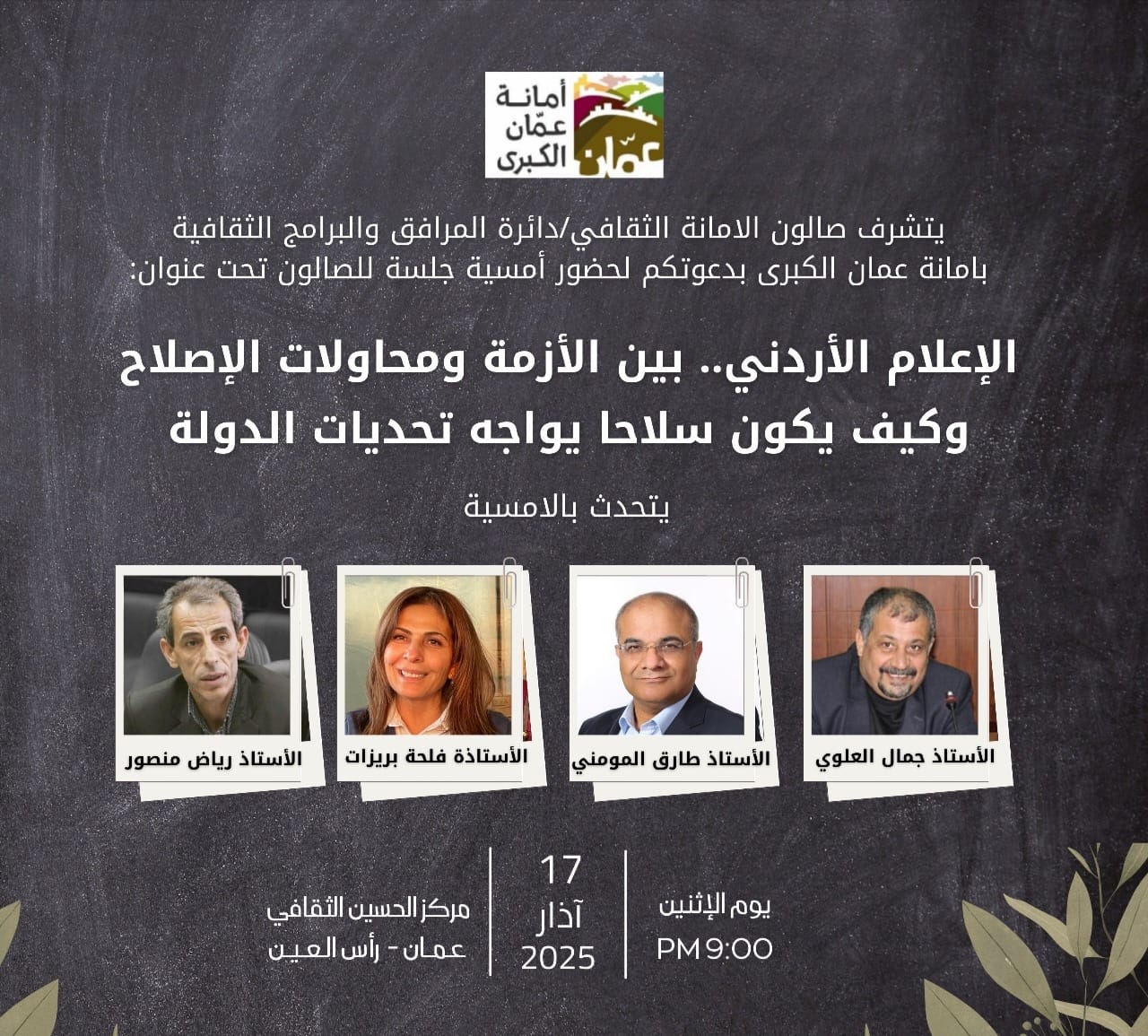 "الإعلام بين الأزمة ومحاولات الإصلاح" أمسية في صالون الأمانة الاثنين16-03-2025 12:21 PM