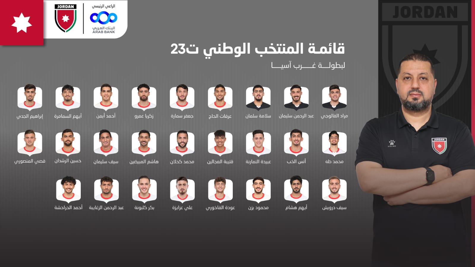 وضمت القائمة: مراد الفالوجي، عبد الرحمن سليمان، سلامة سلمان، عرفات الحاج، جعفر سمارة، زكريا عمرو، أحمد أيمن، أيهم السمامرة، إبراهيم الجدي، محمد طه، أنس الخب، عبيدة النمارنة، قتيبة العجالين، محمد كحلان، هاشم المبيضين، سيف سليمان، حسين الرشدان، قصي المنصوري، سيف درويش، أيهم هشام، محمود يزن، عودة الفاخوري، علي عزايزة، بكر كلبونة، عبد الرحمن الزغايبة، أحمد الحراحشة، فيما التحق علي الحجبي بقائمة النشامى لمواجهتي فلسطين وكوريا الجنوبية ضمن التصفيات المونديالية.