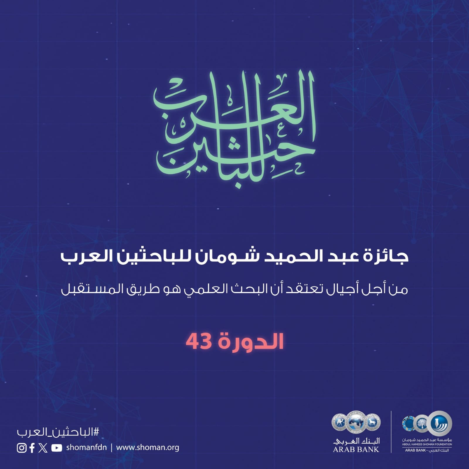 عمون - تواصل مؤسسة عبد الحميد شومان استقبال الطلبات المقدمة لجائزة الباحثين العرب في دورتها الـ(43) للعام 2025.