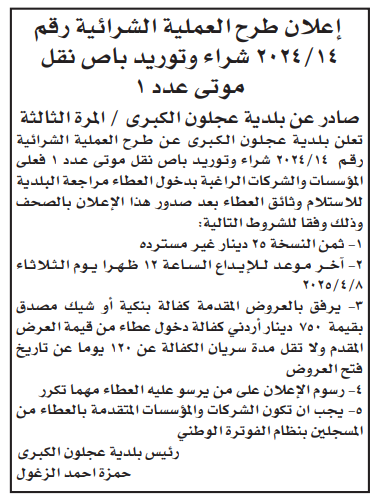 عطاء شراء باص نقل موتى لبلدية عجلون