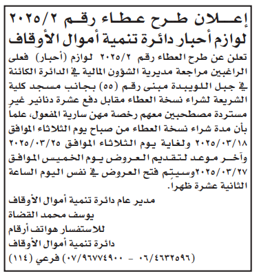 عطاء شراء لوازم احبار لدائرة تنمية اموال الاوقاف