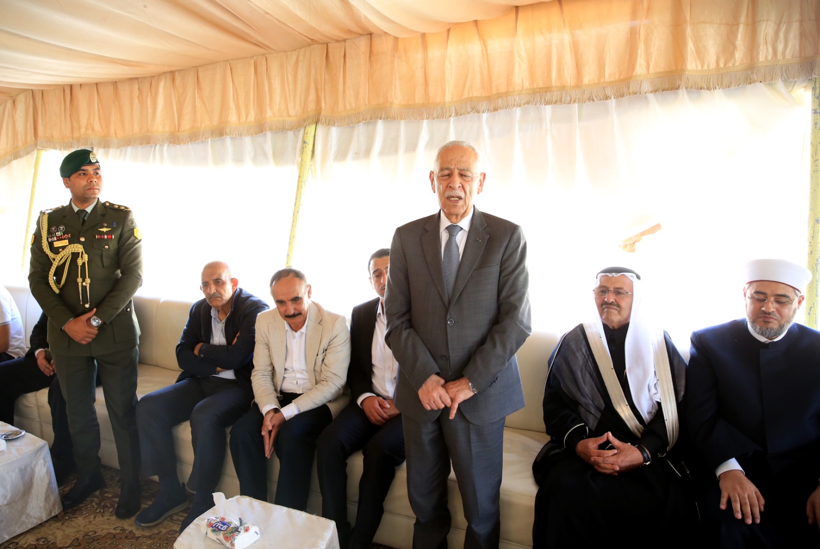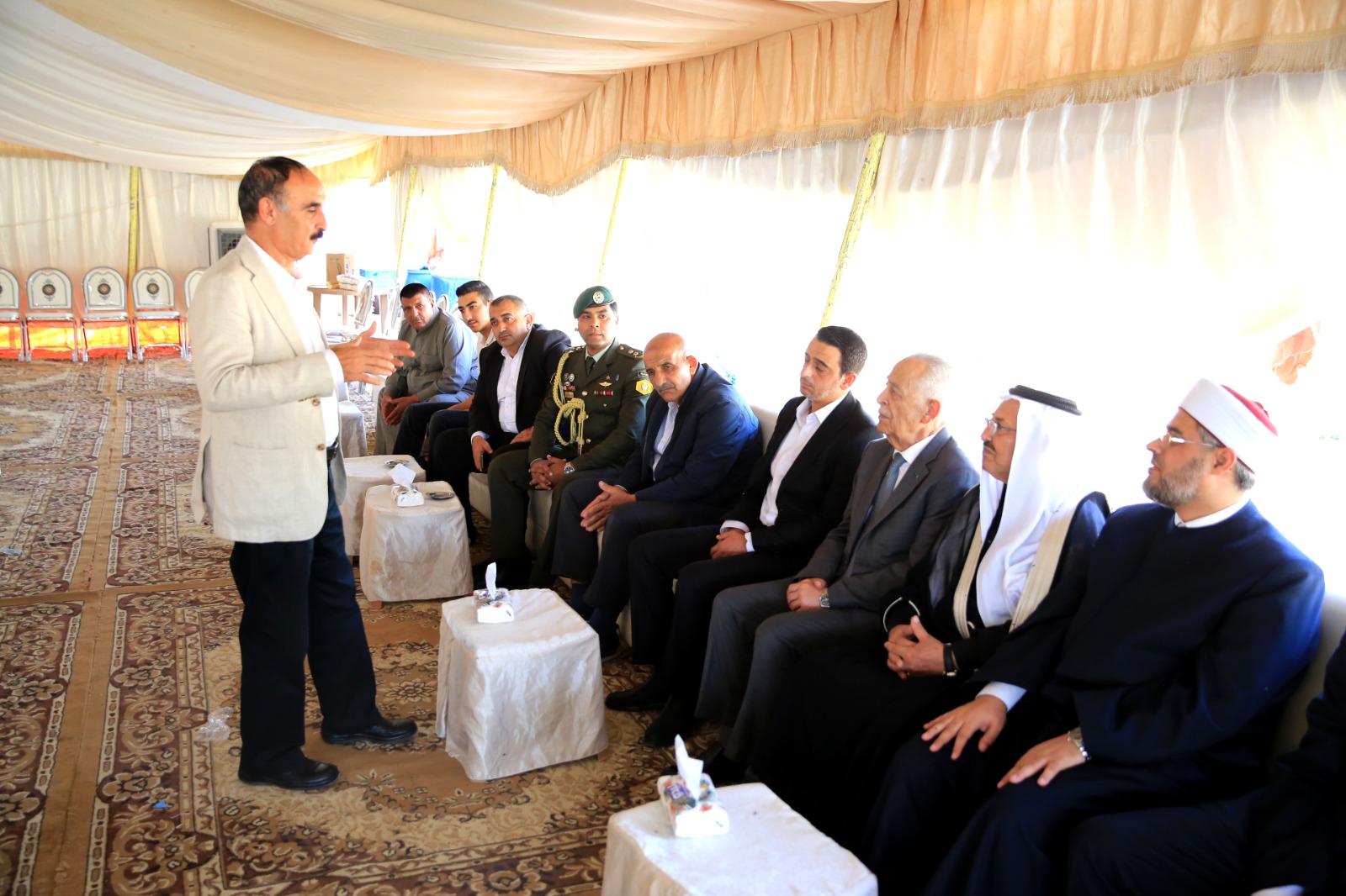 عمون - مندوبا عن جلالة الملك عبدالله الثاني، وسمو الأمير الحسين بن عبدالله الثاني، ولي العهد، قدم رئيس الديوان الملكي الهاشمي يوسف حسن العيسوي، اليوم الثلاثاء، واجب العزاء إلى عشائر العدوان، بوفاة العميد المتقاعد ياسين صالح معزي العدوان. |