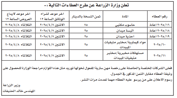 عطاءات صادرة عن وزارة الزراعة