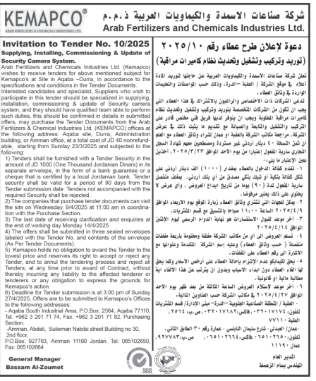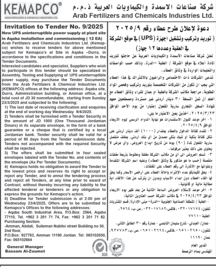 عطاءات صادرة عن شركة الاسمدة والكيماويات العربية