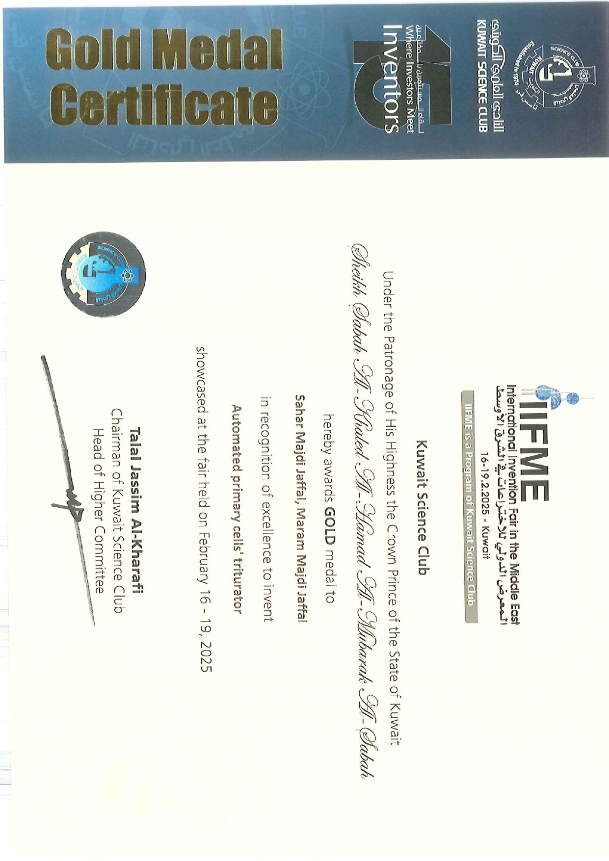 عمون - في إنجاز علمي جديد يُضاف إلى سجل الابتكار الأردني، فازت الدكتورة سحر جفال من كلية الصيدلة في جامعة عمان العربية وبمشاركة المهندسة مرام جفال، بالميدالية الذهبية في المعرض الدولي للاختراعات في الشرق الأوسط الذي أقيم في دولة الكويت الشقيقة بمشاركة واسعة من عدة دول حول العالم، وكانت الدكتورة سحر والمهندسة مرام الممثلتين الوحيدتين للملكة الأردنية الهاشمية في هذا الحدث العلمي المرموق، حيث قدّمتا اختراعًا مبتكرًا حاز إعجاب لجنة التحكيم وخبراء التكنولوجيا والعلوم، ويهدف الاختراع إلى تحسين استخلاص الخلايا الاولية من الانسجة ما يعكس التقدم العلمي الذي يشهده الأردن في البحث والابتكار، هذا وقد زار المعرض السفير الاردني في دولة الكويت السيد سنان المجالي والذي أعرب عن فخره بالاختراع وقدم تشجيعه للمشتركتين الاردنيتين. |