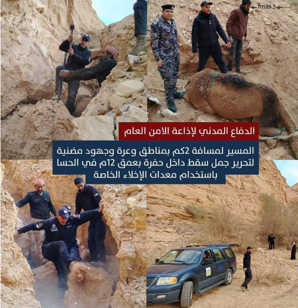 عمون - بذلت كوادر دفاع مدني الصحراوي جهود مضنية بعد المسير لمسافة 2 كم في مناطق وعرة في منطقة الحسا، لإنقاذ وإخلاء جمل سقط داخل حفرة بعمق أكثر من 12 مترا.