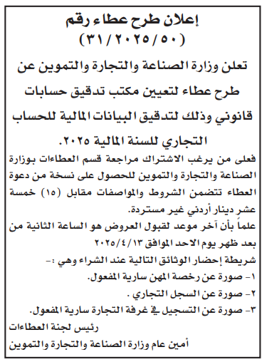 عطاء لتعيين مكتب تدقيق حسابات قانوني لوزارة الصناعة والتجارة والتموين