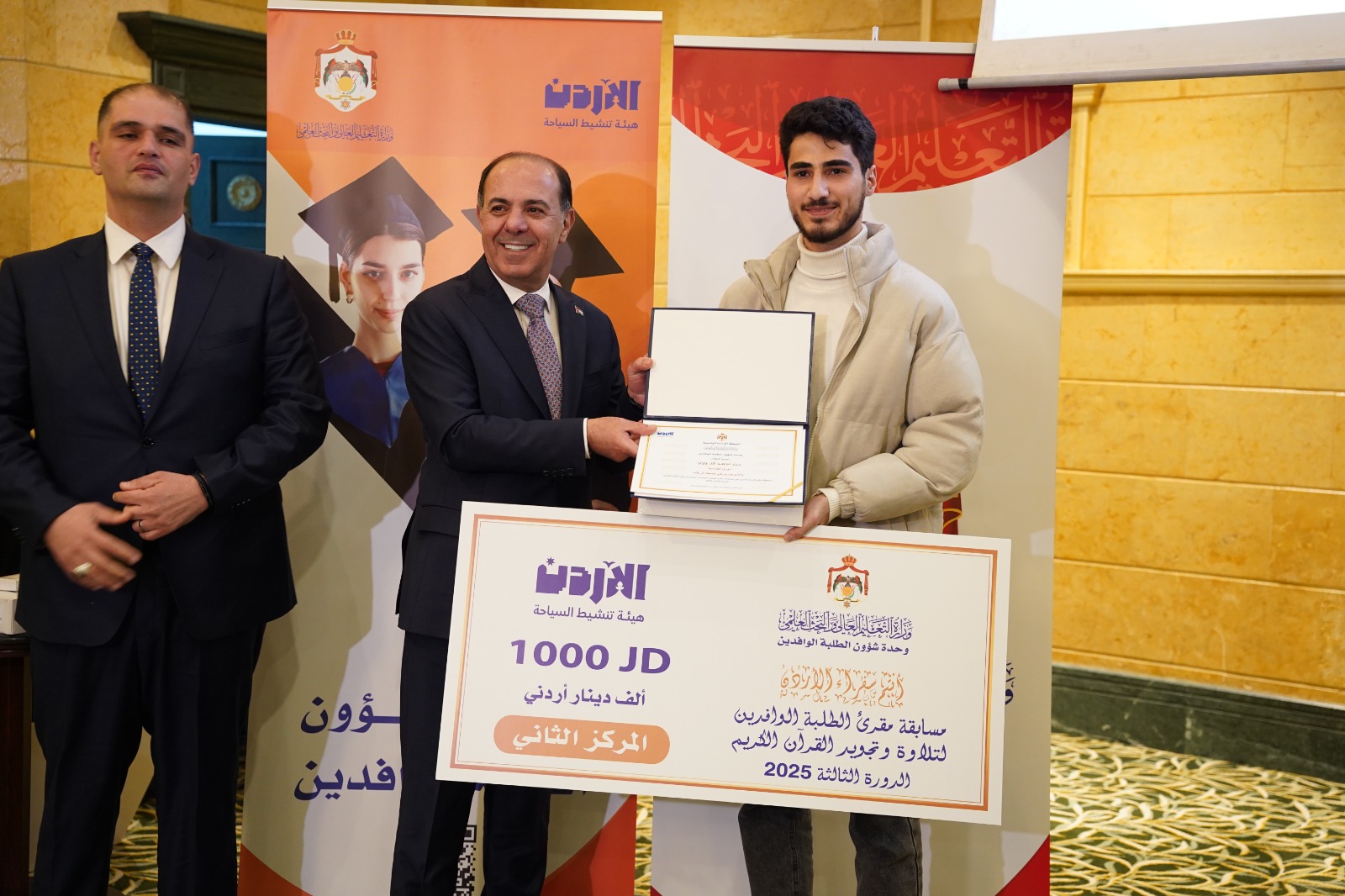 عمون - حقق الطالب بدر محمد الحوري، وهو من الجنسية السورية ويدرس في جامعة الزرقاء، إنجازًا متميزًا بحصوله على المركز الثاني في مسابقة "مقرئ الطلبة الوافدين" 2025، التي نظّمتها وزارة التعليم العالي والبحث العلمي بالتعاون مع هيئة تنشيط السياحة.