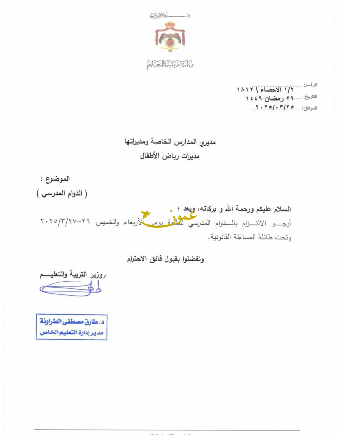 التربية تعمم بإلزام المدارس الخاصة بدوام الأربعاء والخميس26-03-2025 02:29 AM
