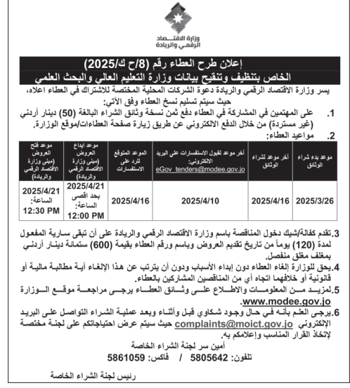 عطاء صادر عن وزارة الاقتصاد الرقمي