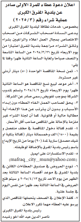 عطاء شراء خدمات التنظيف لبلدية المفرق الكبرى
