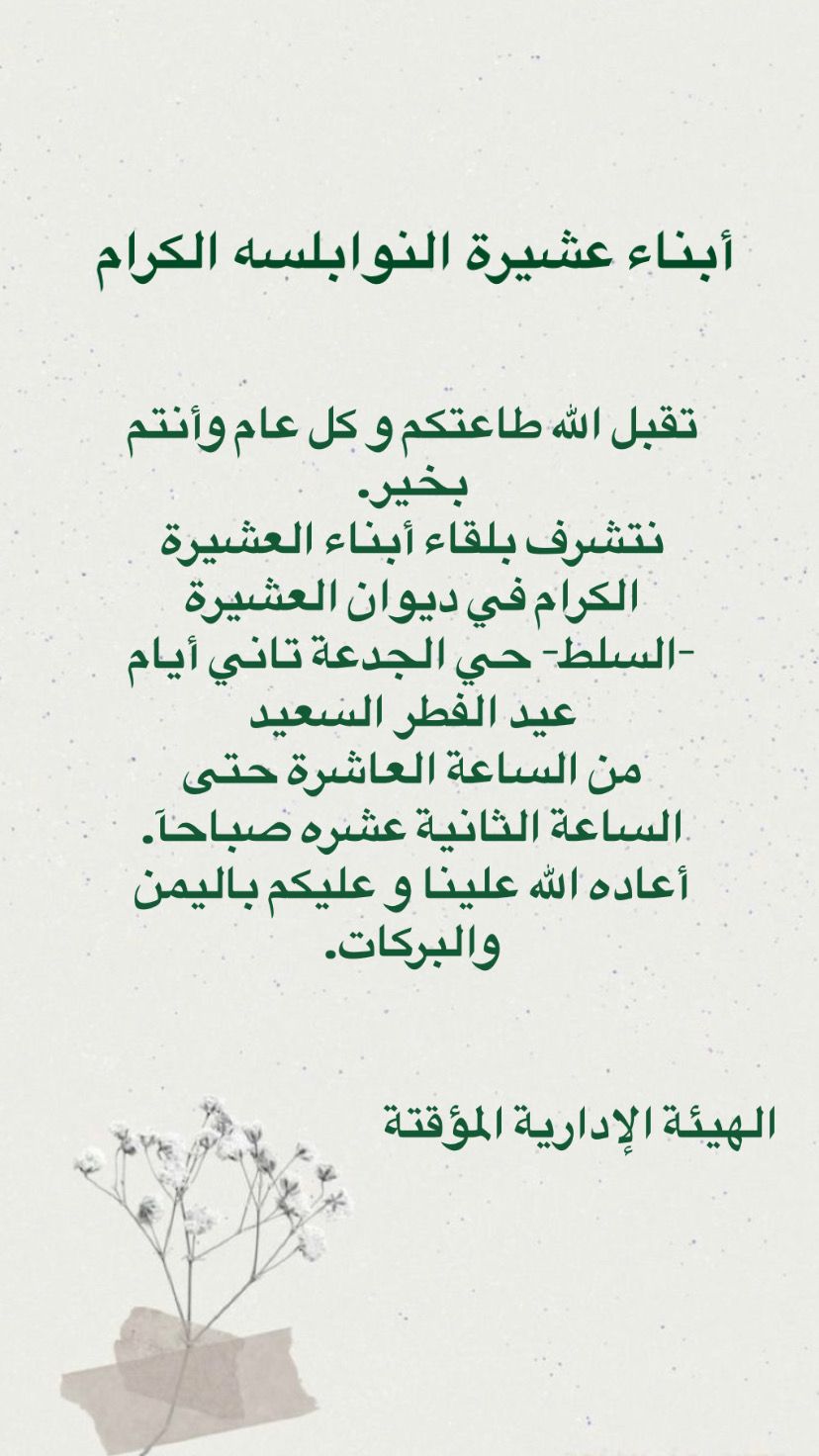 عمون - دعت الهيئة الإدارية لعشيرة النوابلسة أبناء العشيرة، للاجتماع في السلط ثاني أيام عيد الفطر في الديوان بمدينة السلط.