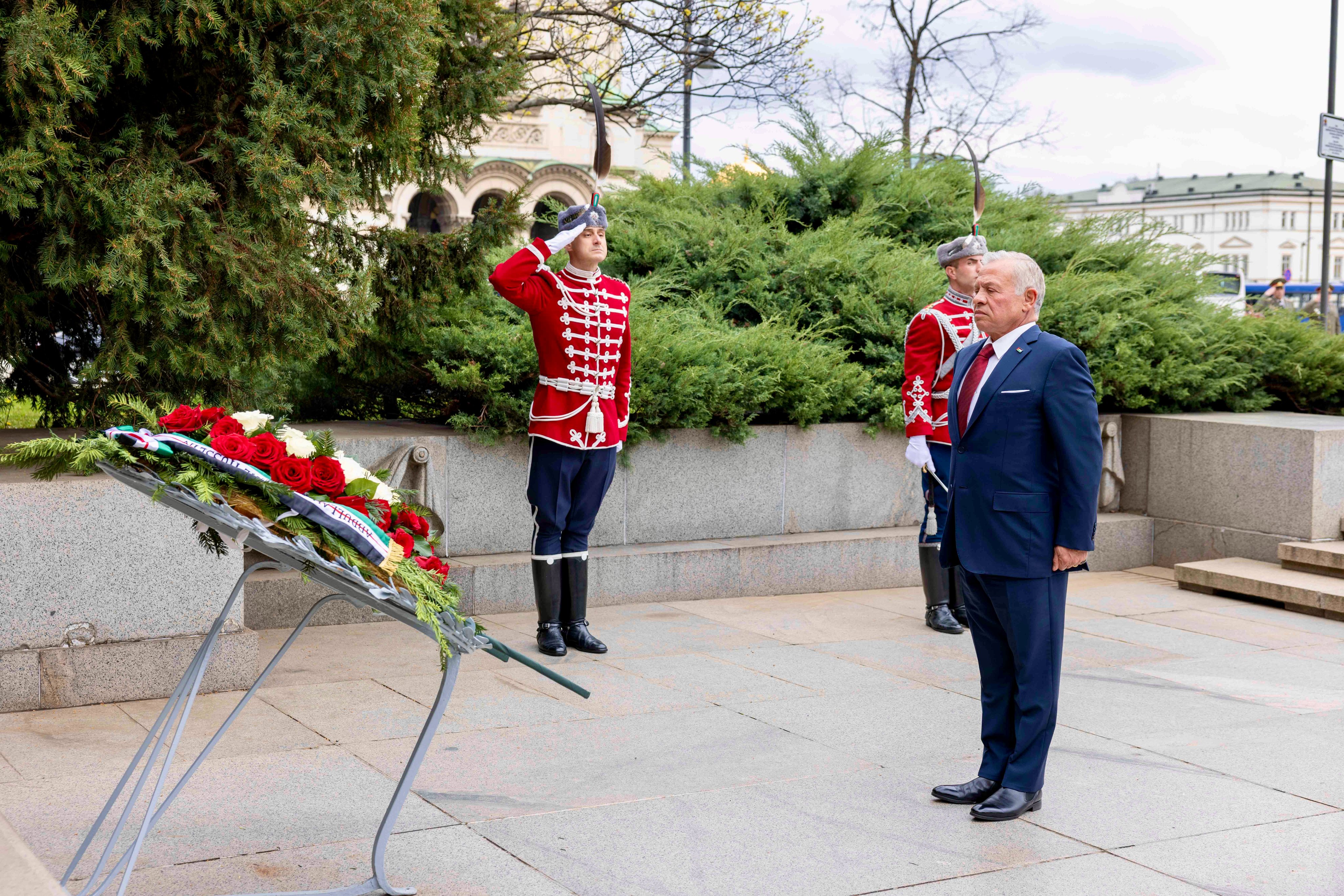 عمون - وضع جلالة الملك عبدالله الثاني، الخميس، إكليلا من الزهور على نصب الجندي المجهول في ساحة ألكسندر نيفيسكي في العاصمة صوفيا.