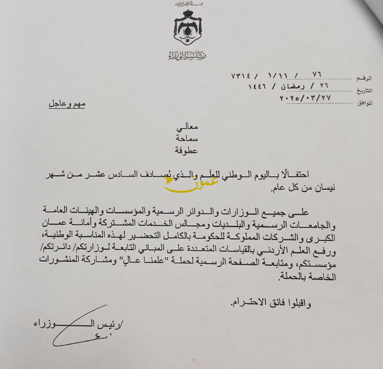 عمون -ينال المعاني- أوعز رئيس الوزراء الدكتور جعفر حسان، برفع العلم الاردني على المباني الحكومية احتفالا باليوم الوطني للعلم والذي يصادف السادس عشر من شهر نيسان من كل عام. |