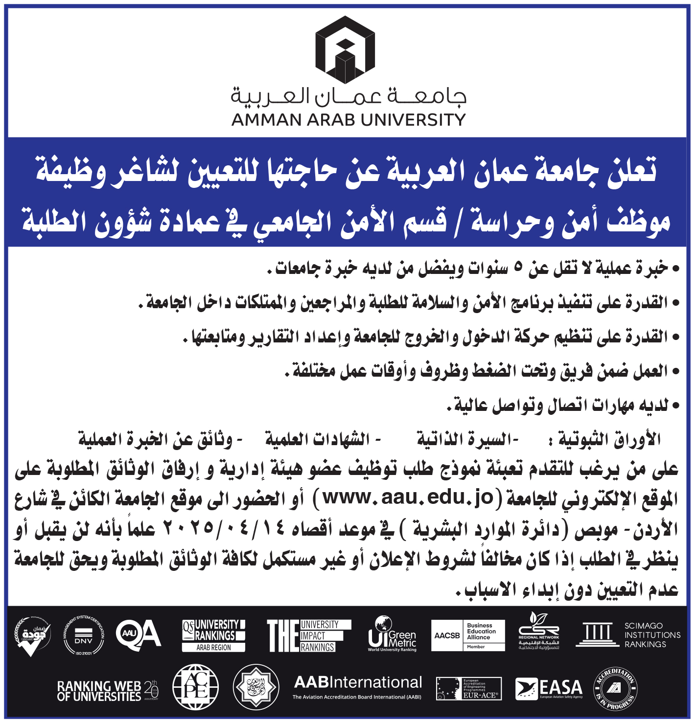 عمون - تعلن جامعة عمان العربية عن حاجتها للتعيين لشاغر وظيفة "موظف أمن وحراسة / قسم الأمن الجامعي في عمادة شؤون الطلبة" |