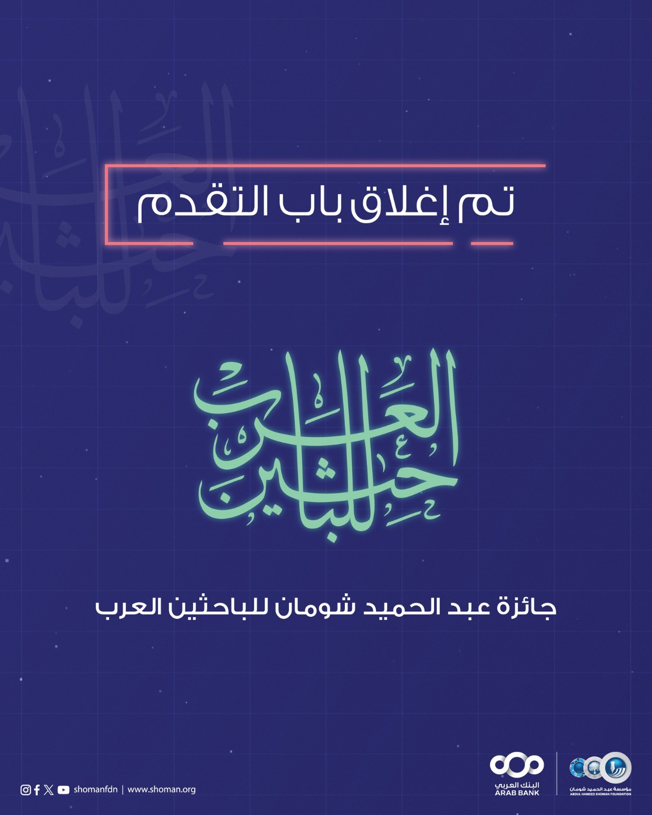 عمون - أعلنت مؤسسة عبد الحميد شومان، ذراع البنك العربي للمسؤولية الثقافية والاجتماعية، عن إغلاق باب التقدم لجائزة الباحثين العرب في دورتها الـ(43) للعام 2025.