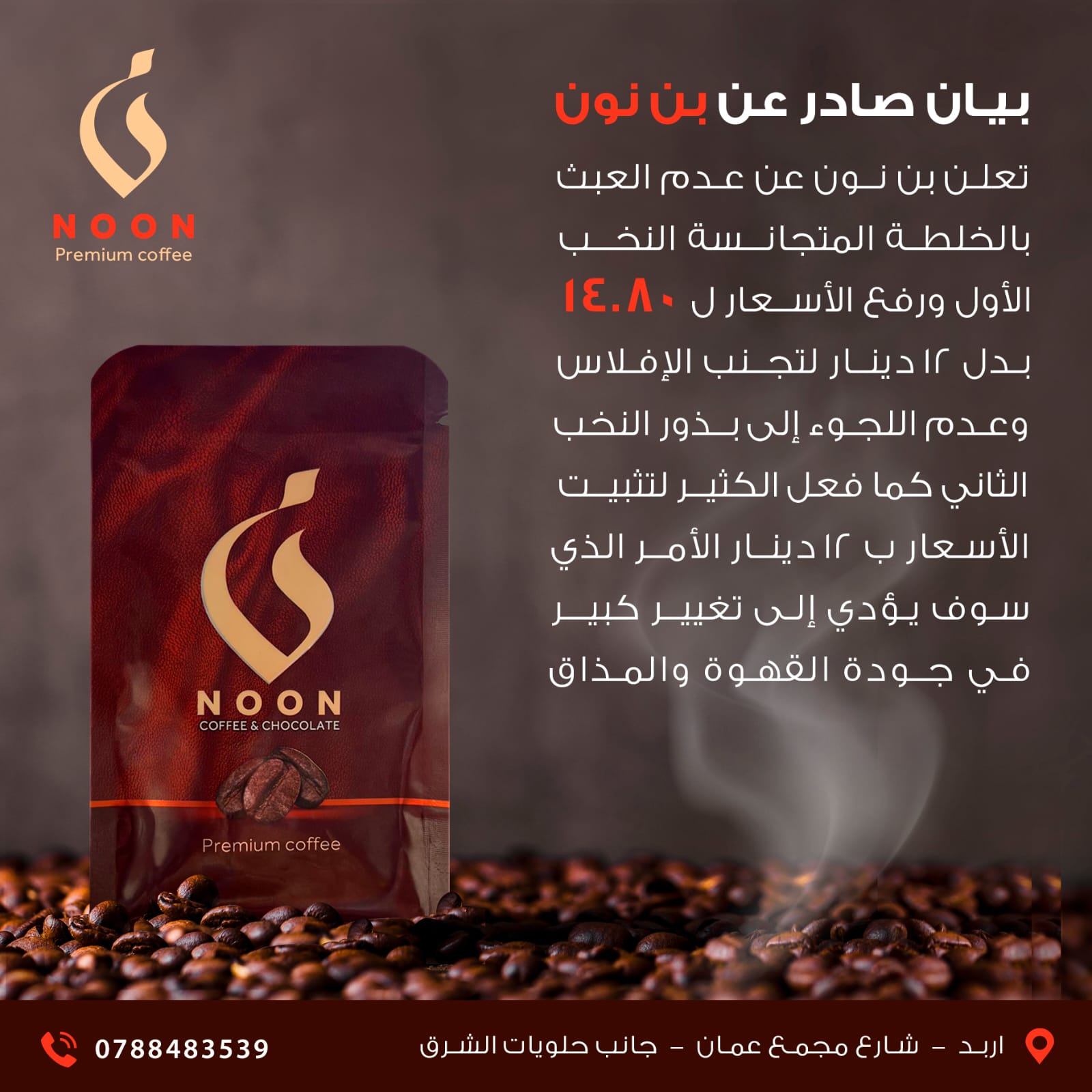 وعليه تعلن مجموعة بن نون عن رفع اسعارها إلى 14.80 بدلا من 12 دينارا حفاظا على عدم العبث في الخلطة المتجانسة النخب الاول الثابتة منذ عشرات السنين حيث ان اي تغيير فيها سيتم ملاحظته في اول رشفة قهوة.