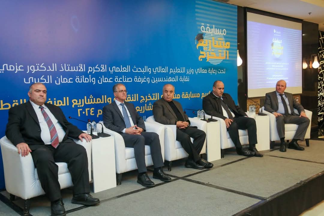 عمون - بحضور وزير التعليم العالي والبحث العلمي الأستاذ الدكتور عزمي محافظة، وعطوفة رئيس جامعة عجلون الوطنية الأستاذ الدكتور فراس الهناندة، ونائب نقيب المهندسين المهندس فوزي المسعد، والمدير التنفيذي للنقل في أمانة عمّان الكبرى المهندس رياض الخرابشة، ورئيس المسابقة الدكتور محمد غيث، كرّمت نقابة المهندسين الأردنيين يوم امس السبت 12 نيسان 2025 فريق جامعة عجلون الوطنية الفائز في مسابقة مشاريع التخرج الفنية والصناعية ومشاريع المرور، التي أُقيمت بالتعاون مع أمانة عمّان الكبرى وغرفة صناعة عمّان، في فندق اللاند مارك بالعاصمة عمّان.