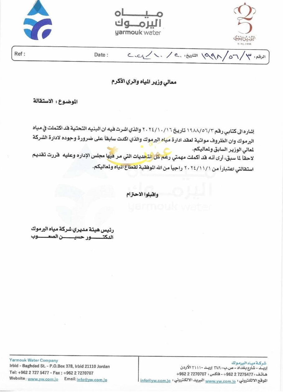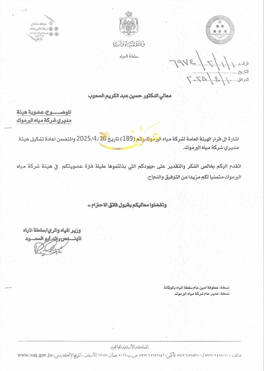 إعادة تشكيل هيئة مديري مياه اليرموك برئاسة المحيسن خلفا للصعوب14-04-2025 05:56 PM