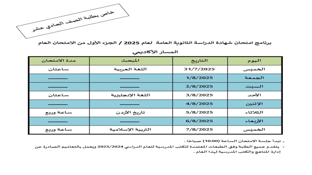 جدول امتحانات التوجيهي للصف الحادي عشر15-04-2025 08:30 AM