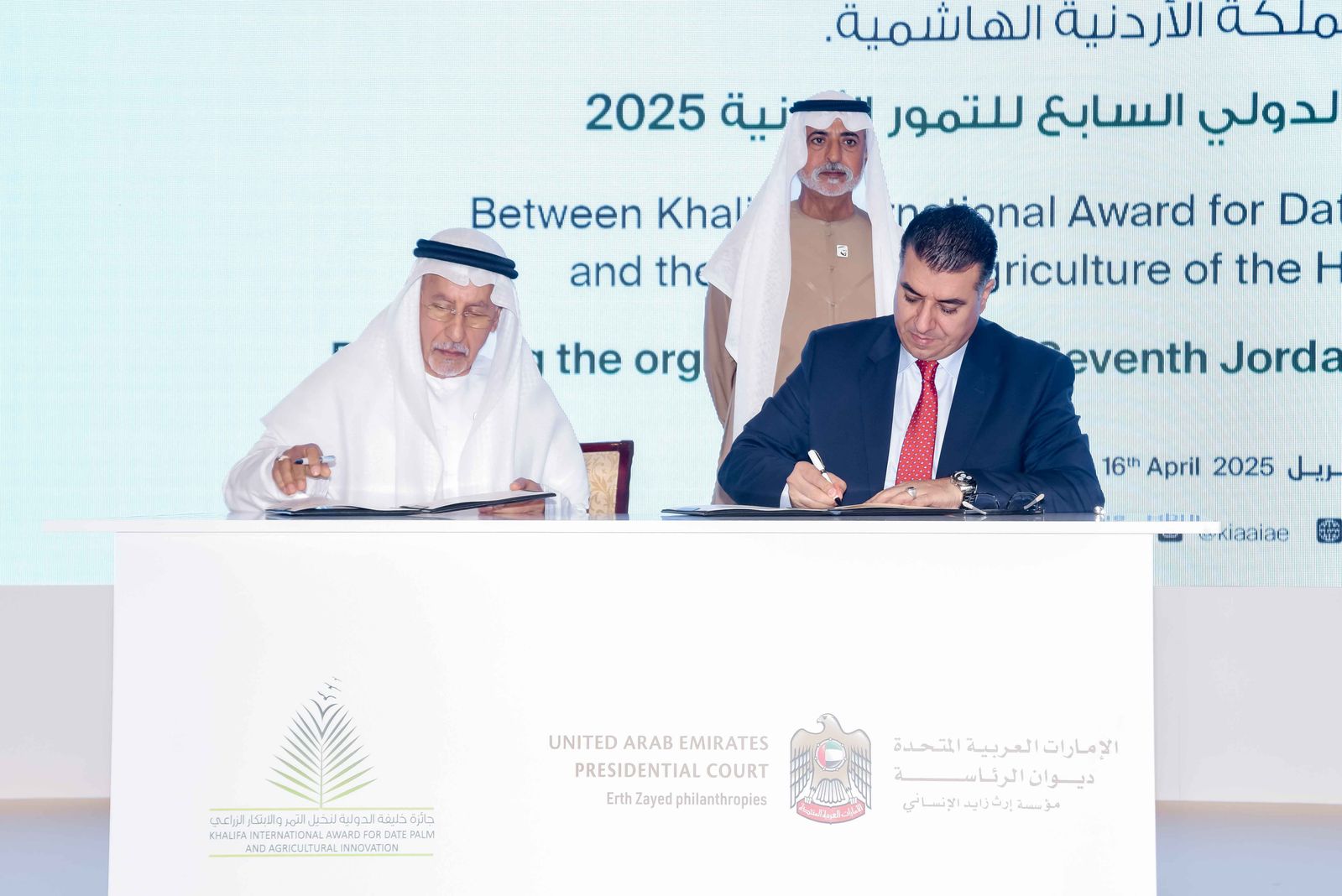عمون - شهد الشيخ نهيان بن مبارك آل نهيان وزير التسامح والتعايش، رئيس مجلس أمناء جائزة خليفة الدولية لنخيل التمر والابتكار الزراعي، توقيع مذكرة تفاهم لعام 2025 بين الأمانة العامة للجائزة مع وزارة الزراعة الاردنية وقعها المهندس خالد الحنيفات وزير الزراعة والدكتور عبدالوهاب زايد امين عام جائزة خليفة الدولية لنخيل التمر والابتكار الزراعي، في شأن تنظيم المهرجان الدولي السابع للتمور الأردنية، كما شهد توقيع 09 مذكرات تفاهم بين الجائزة وعدد من وزارات الزراعة والمنظمات الدولية...وذلك خلال حفل جائزة خليفة الدولية لنخيل التمر والابتكار الزراعي، بدورتها السابعة عشرة 2025 الذي اقيم في عاصمة دولة الإمارات العربية المتحدة ابوظبي