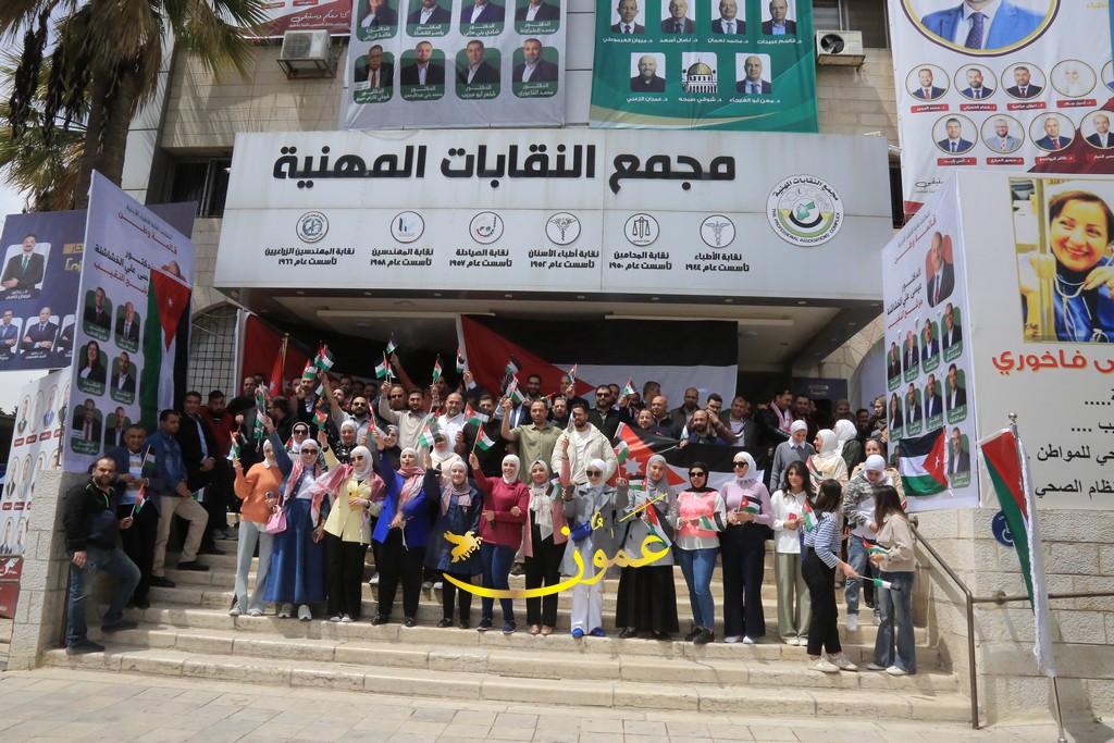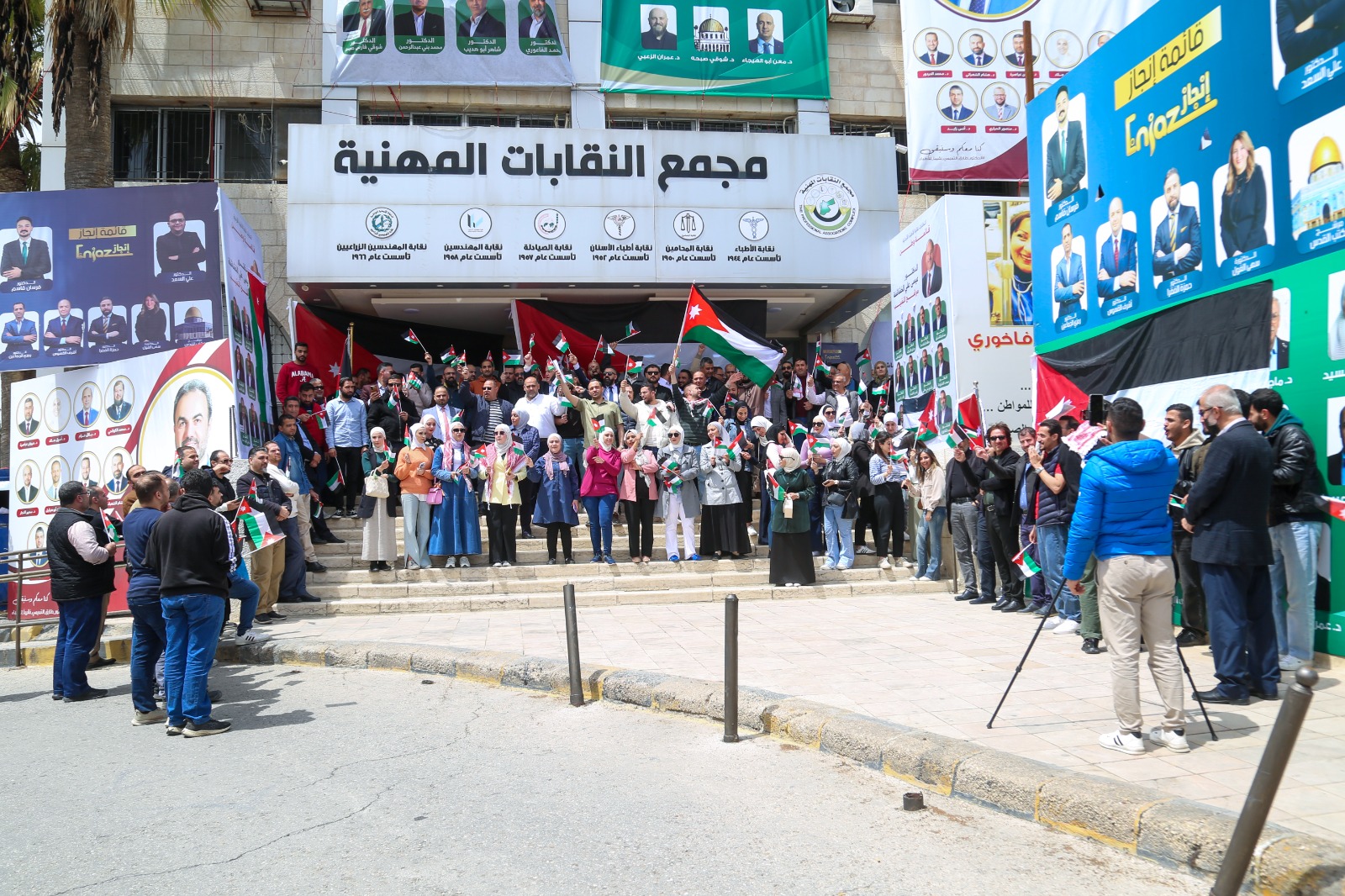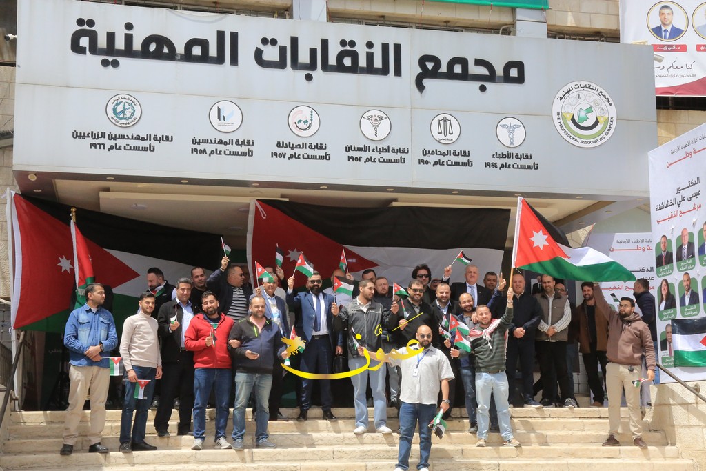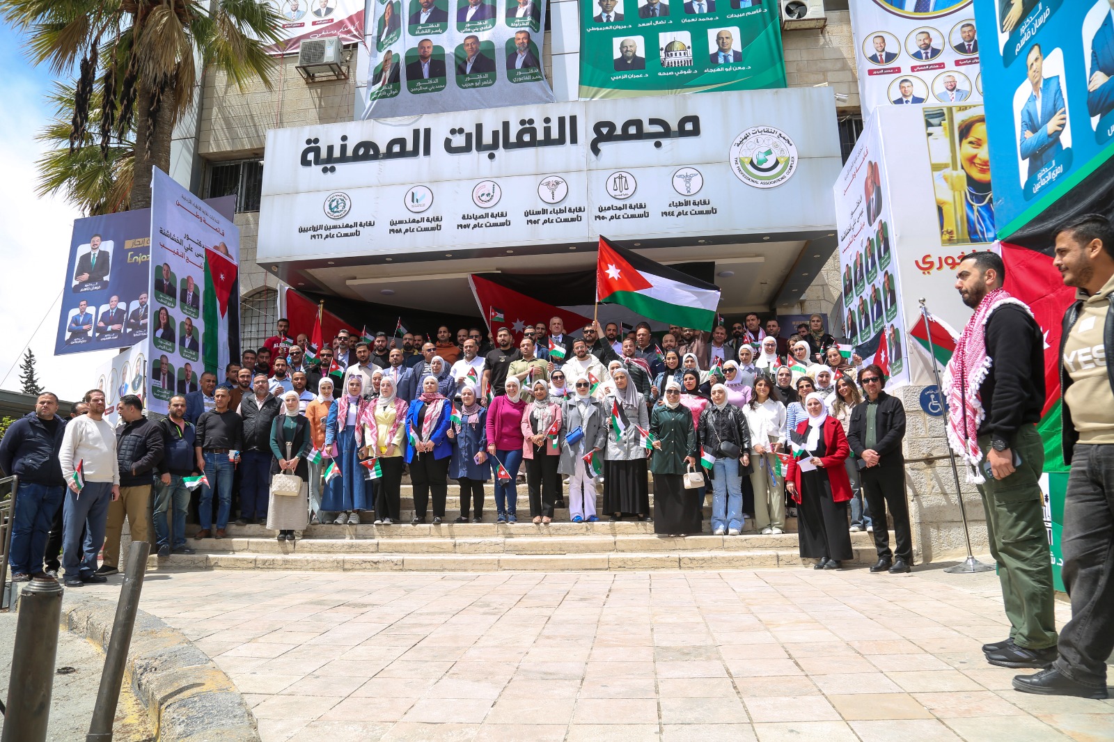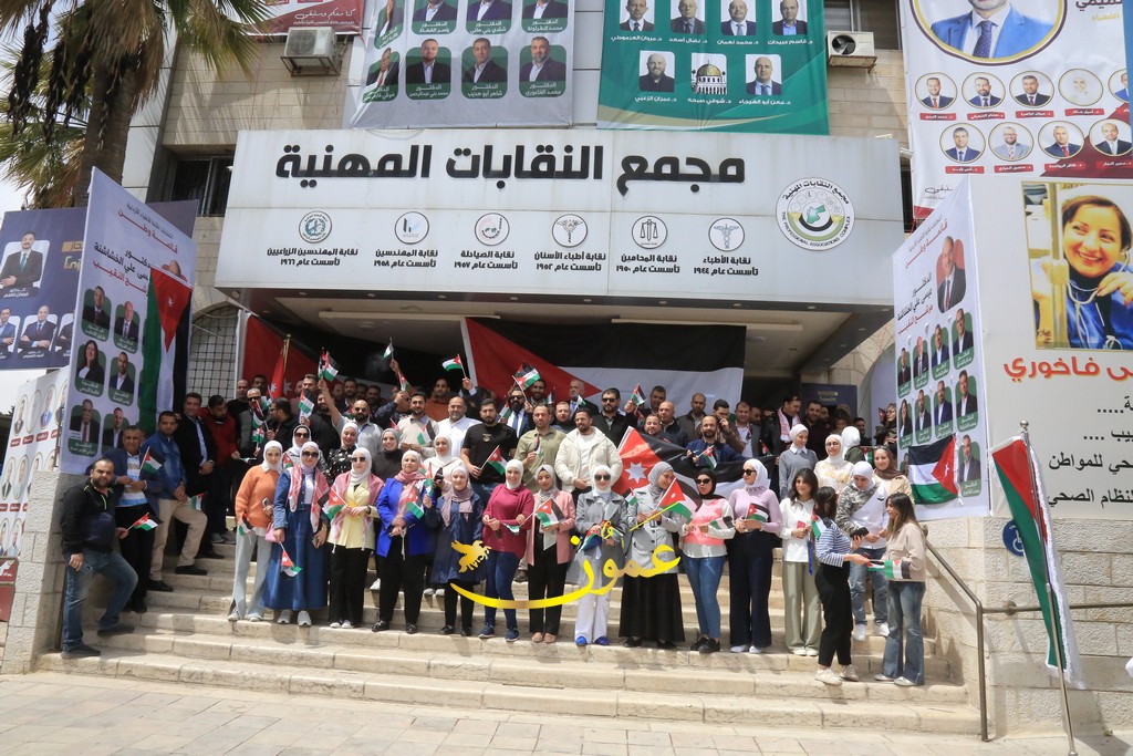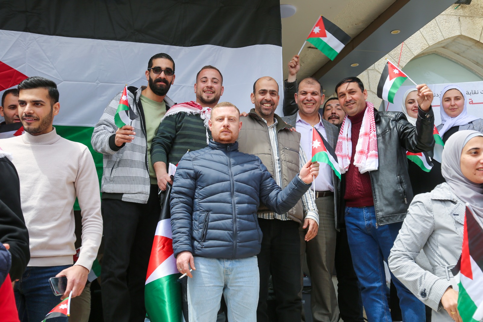 عمون - احتفالا بيوم العلم الأردني وتجسيدا للاعتزاز بعلم المملكة الاردنية الهاشمية، رمز الوحدة والسيادة والهوية الوطنية الأسمى، نفذت نقابة المهندسين الأردنيين، اليوم الأربعاء، وقفة تضامنية امام مجمع النقابات المهنية، لموظفي النقابة.