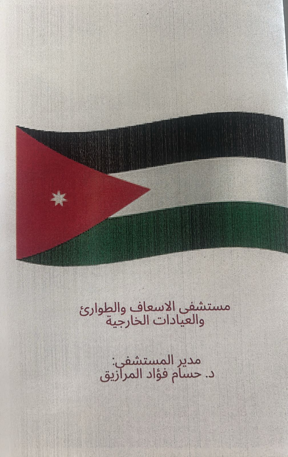 وحيث قام مدير مستشفى الاسعاف و الطوارئ و العيادات الخارجية الدكتور حسام فؤاد المرازيق بالاجتماع بالكوادر الطبيه العامله في الطوارئ و تبيين تاريخ العلم الاردني و دلالاته التاريخية و الحضارية و مواصفات العلم الاردني كما نص عليه الدستور الاردني في المادة الرابعة. و بأن هذا اليوم هو يوم عيد و احتفال و مسلكً للتغير و ترسيخ لتاريخ العلم الاردني بما فيه خدمة الاردن و الاردنيين و المرضى المراجعين للطوارئ و العيادات، و احتفالاً بهذا اليوم الكبير تم رفع العلم الاردني على سارياتٍ على أبواب المستشفى و توزيع كتيبات على الكوادر الطبيه و المراجعين تبين تاريخ العلم الاردني و دلالاته و معاني الوانه و رمزياتها .