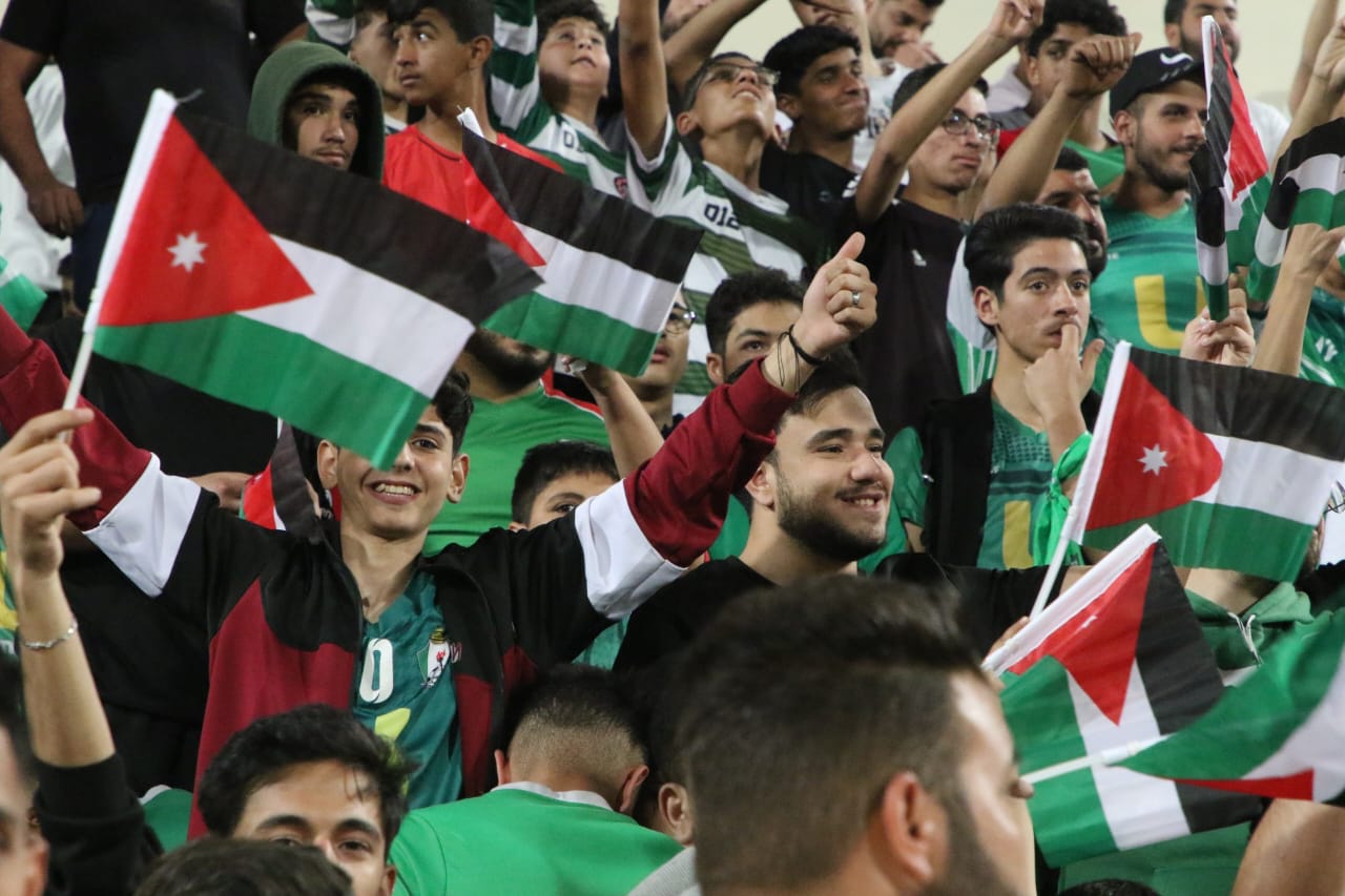 عمون - احتفت جماهير وفريقي الوحدات والحسين اربد بالعلم الأردني ورفعته خلال المباراة المقامة على ملعب الملك عبدالله الثاني - القويسمة، اليوم الجمعة. |