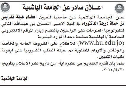 الجامعة الهاشمية بحاجة لتعيين اعضاء هيئة تدريسية