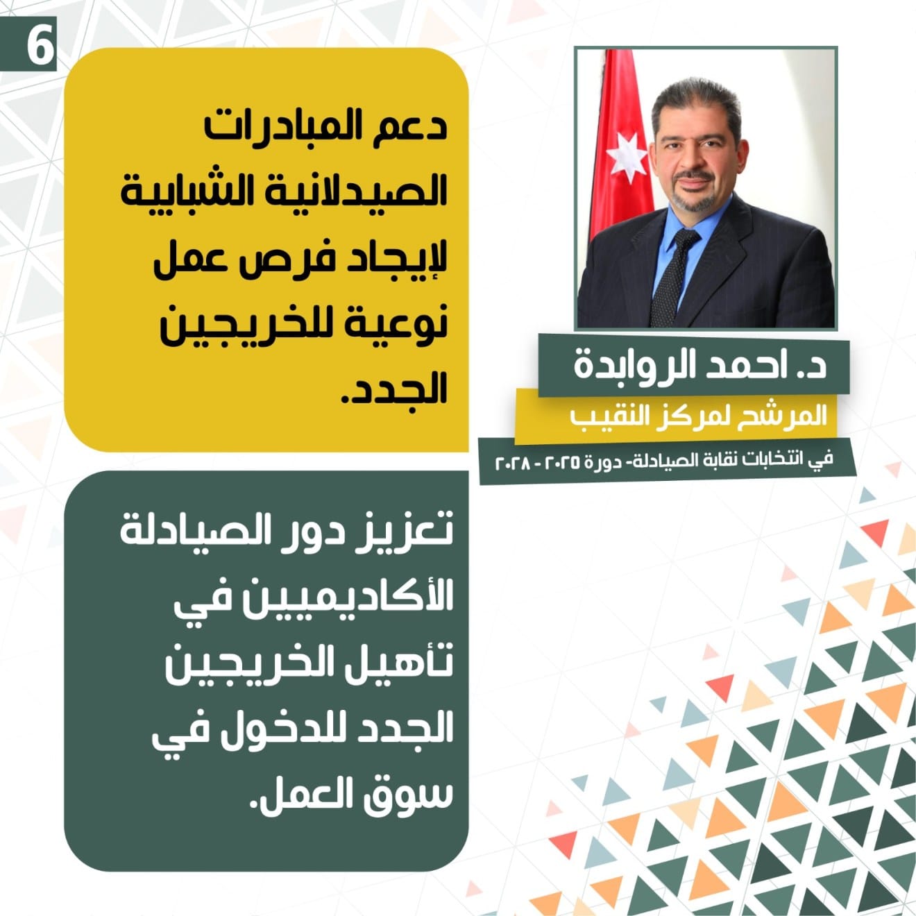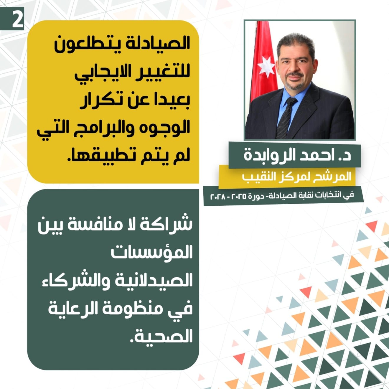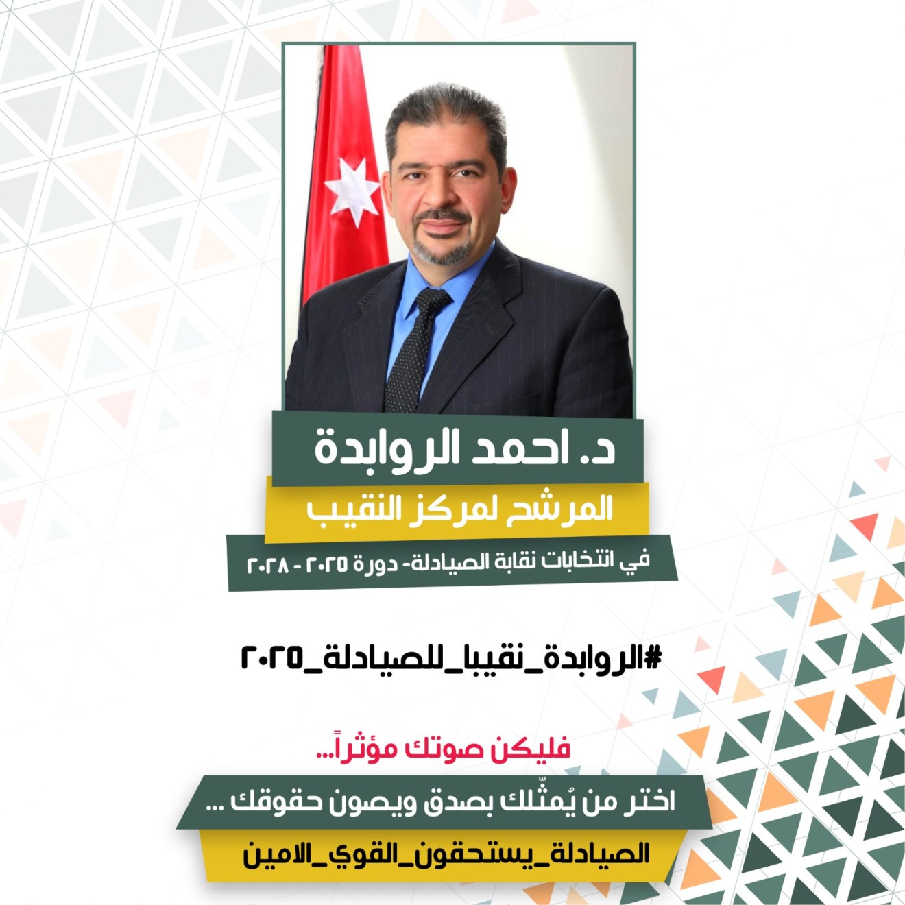 وكان د. احمد الروابدة قد نشر في وقت سابق؛ ملامح البيان الانتخابي الذي سيتقدم به مع قائمته الانتخابية للهيئة العامة للنقابة في انتخابات نقابة الصيادلة- دورة ٢٠٢٥ – ٢٠٢٨؛ وتاليا ابرز النقاط: