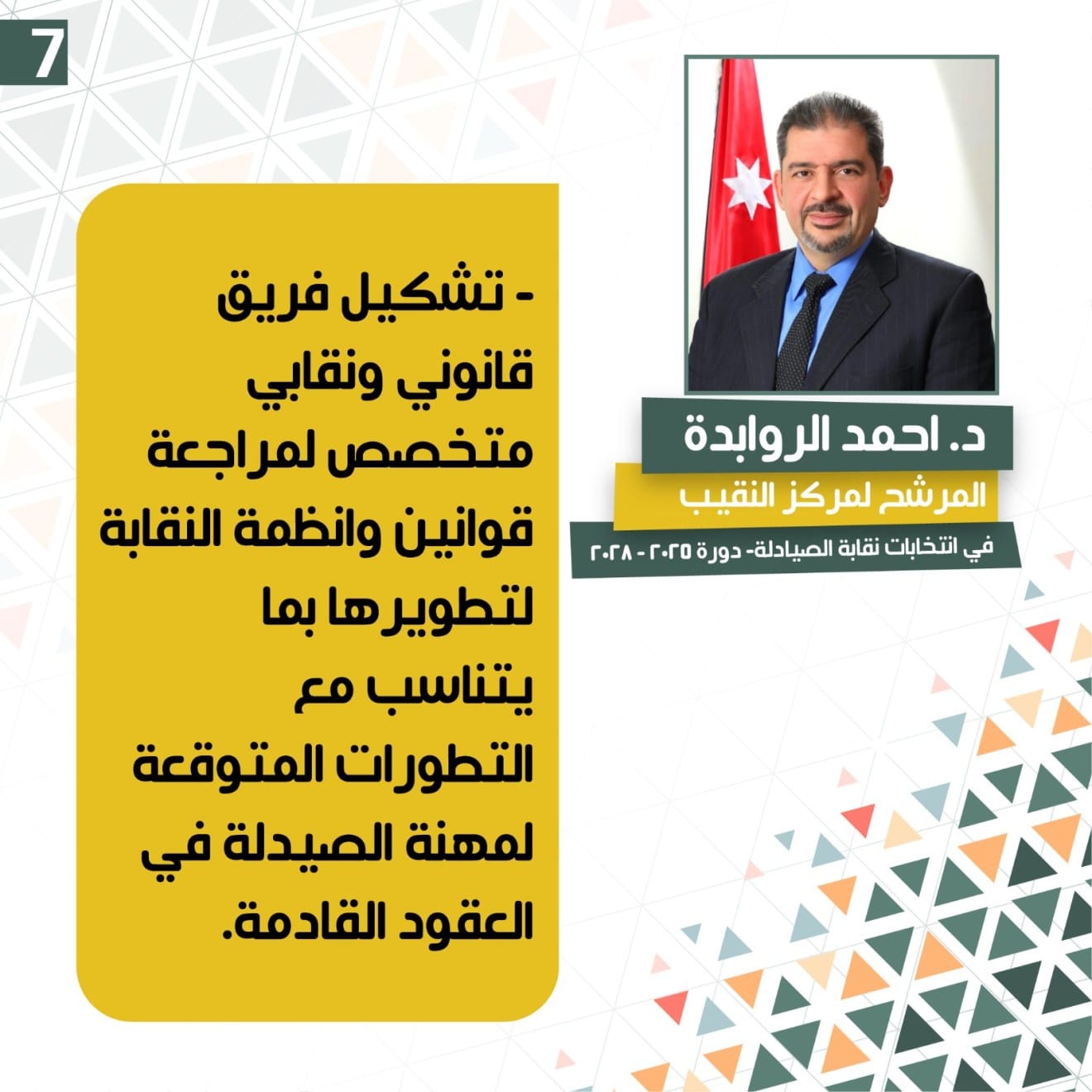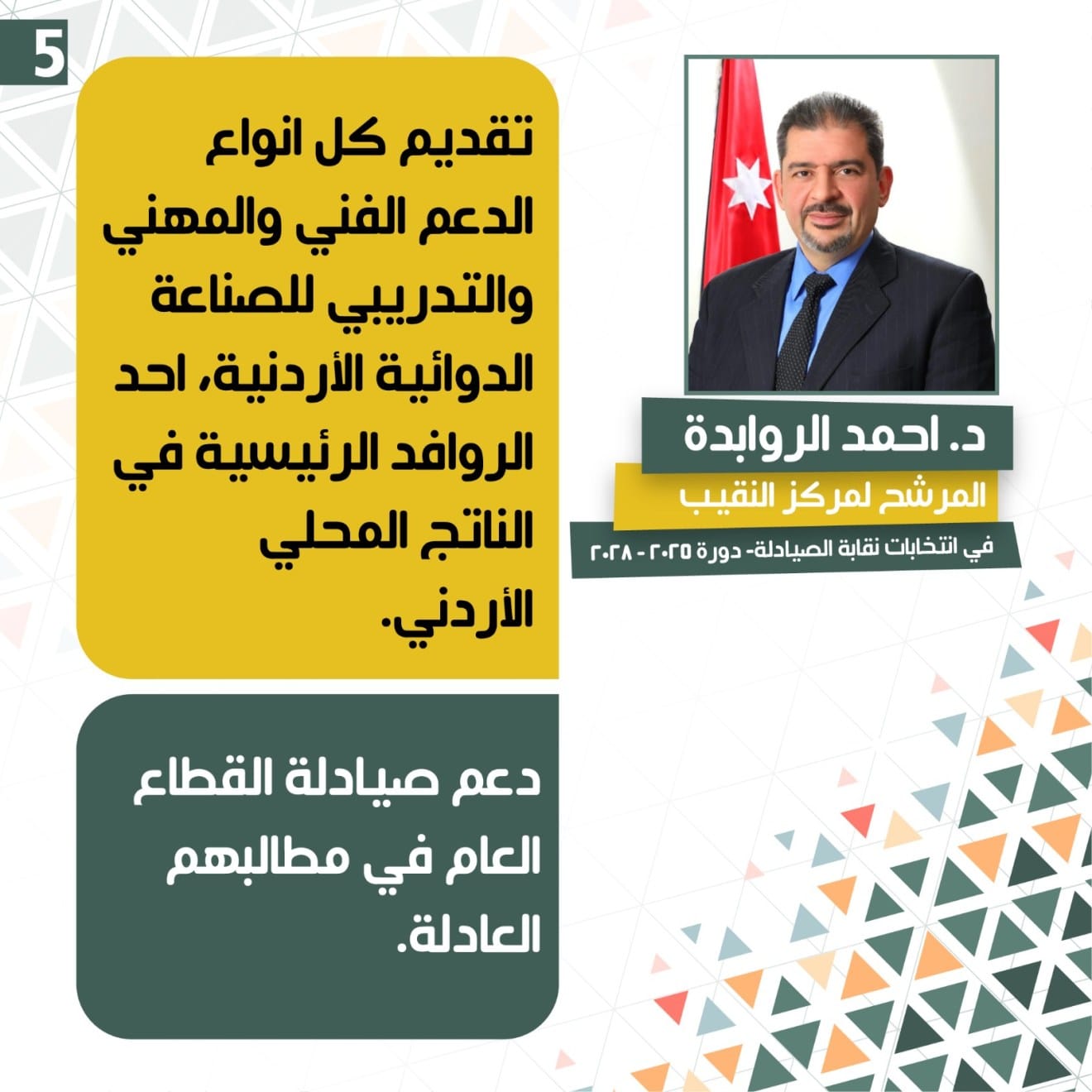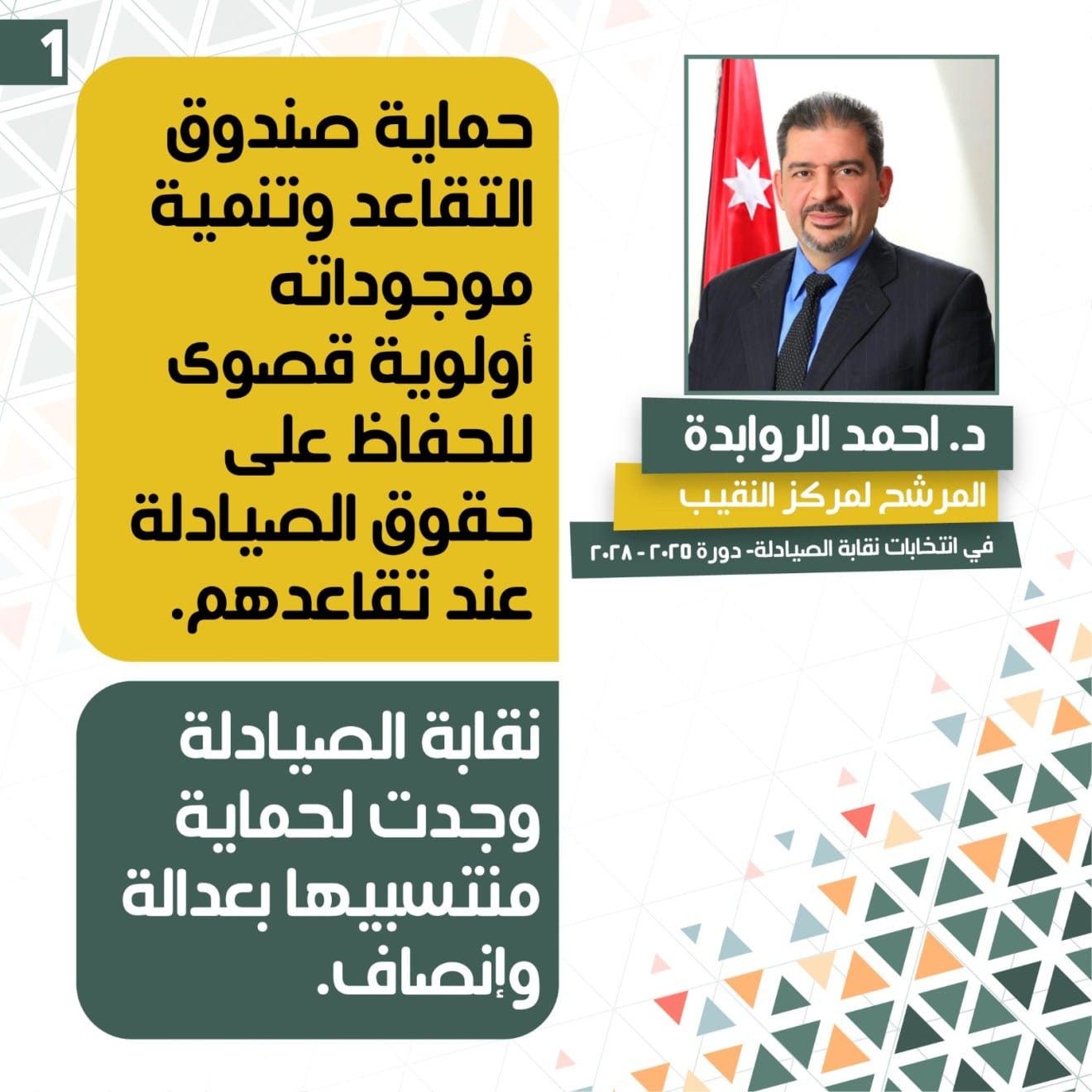 وكان د. احمد الروابدة قد نشر في وقت سابق؛ ملامح البيان الانتخابي الذي سيتقدم به مع قائمته الانتخابية للهيئة العامة للنقابة في انتخابات نقابة الصيادلة- دورة ٢٠٢٥ – ٢٠٢٨؛ وتاليا ابرز النقاط: