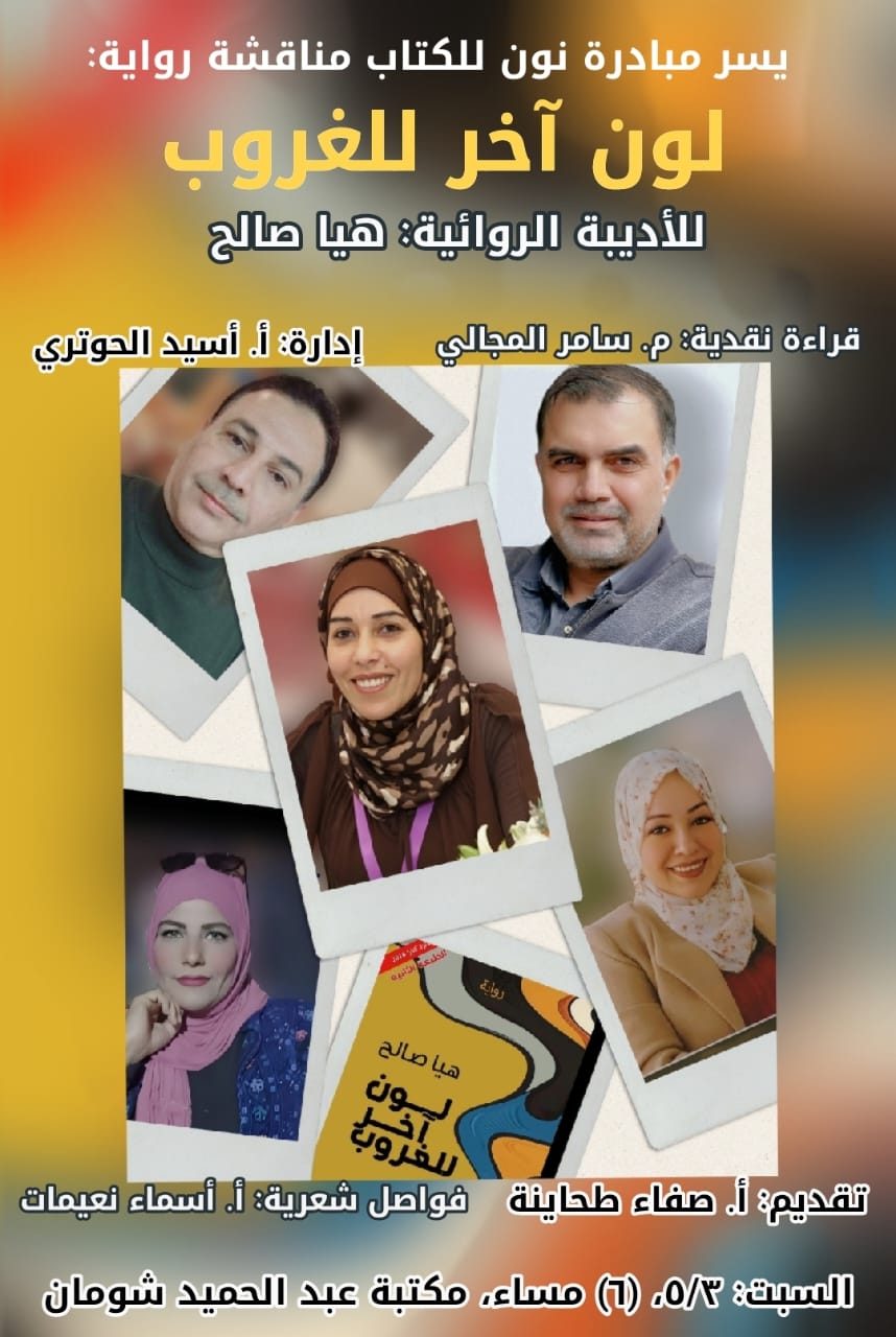 عمون - تعقد مبادرة نون للكتاب جلستها الثامنة والعشرين لمناقشة رواية "لون آخر للغروب" للروائية هيا صالح في مكتبة عبد الحميد شومان في جبل عمان، يوم السبت الموافق (٢٠٢٥/٠٥/٠٣) الساعة السادسة مساء. تقدم السيدة صفاء الطحاينة المشاركين في الجلسة. يعرض المهندس الناقد سامر المجالي قراءة نقدية للرواية. تشارك الشاعرة أسماء النعيمات في فقرة الفواصل الشعرية، ويدير النقاش الناقد أسيد الحوتري. يُنقل النقاش في بث حي ومباشر على صفحة مبادرة نون للكتاب.
