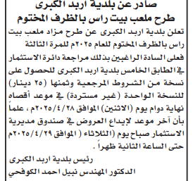 عطاء انشاء ملعب صادر عن بلدية اربد الكبرى