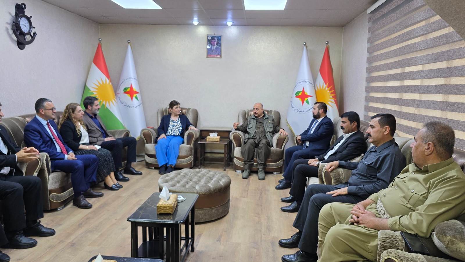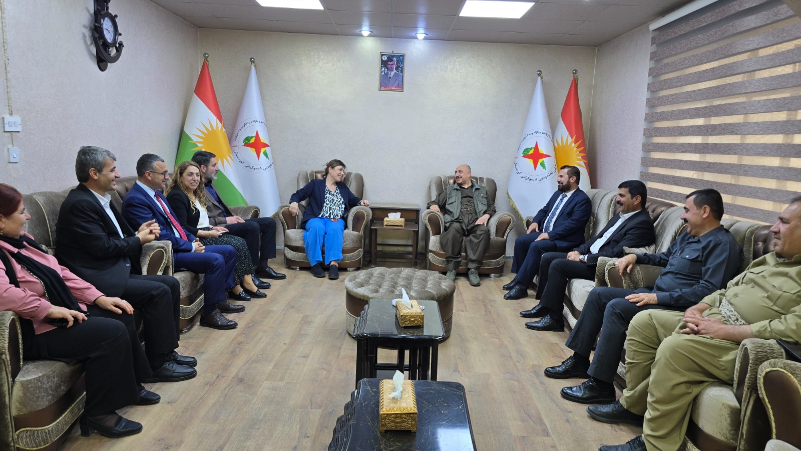 واستقبل مخموري في مقر المكتب السياسي للاتحاد بأربيل العاصمة، بحضور الرفاق (د. شاخوان خالد العضو العامل للمكتب السياسي و شاكر هاشم صالح عضو المكتب السياسي ومسؤول مكتب العلاقات المركزي وفاخر نانەكەلي عضو اللجنة القيادية ومسؤول إقليم اربيل وجلال سمایل العضو العامل لمكتب العلاقات المركزي لـ YNDK )، وفداً رفيعاً من حزب المساواة وديمقراطية الشعوب DEM Partî ضم السادة (مرال دانش بشتاش عضوة برلمان تركيا ورئيسة الوفد و مراد ساریساچ و صالحە ئایدرن و مراد أرن اعضاء برلمان توركيا و عابد أيكه مسؤول علاقات DEM Partî خمي عابدي و أوکار أورينچى عضوي مكتب العلاقات في DEM Partî ) وجرى خلال اللقاء بحث الأوضاع السياسية في اجزاء كوردستان الأربعة وعملية السلام في شمال كوردستان وآخر التطورات والمستجدات والمتغييرات في المنطقة، وتم التأكيد على وحدة الصف والموقف لشعب كوردستان بكل قواها واطرافها السياسية واطيافها، استعداداً للأحتمالات والتحولات التي تستجد على صعيد المنطقة، وتم وصف الوحدة والموقف الكوردستاني المشترك بأنها العامل الرئيس لحماية وارساء المنجزات ونيل المزيد من حقوق شعب كوردستان، وفي محور آخر من اللقاء تم التطرق الى اعتداءات النظام التركي المحتل على المناطق الحدودية لجنوب كوردستان، مشددين على أنه لتجاوز هذه المرحلة ودرء هذه المخاطر لابد من رسم خارطة طريق قومية ووطنية من خلال الحوار الوطني والتشاور القومي بين كافة القوى السياسية الكوردستانية.