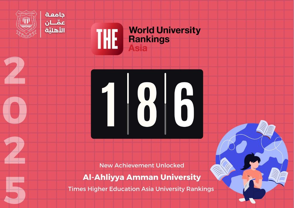 عمون - في إنجاز أكاديمي ريادي جديد ، حضرت جامعة عمان الأهلية وبقوة في تصنيف التايمز للجامعات في دول قارة أسيا 2025 وبالمرتبة 186، ضمن قائمة ضمّت قرابة 1200 جامعة أسيوية ؛ الأمر الذي يعكس التقدم المستمر للجامعة في تعزيز مكانتها الاكاديمية والعلمية والبحثية محلياً وعربياً وقارياً وعالمياً .