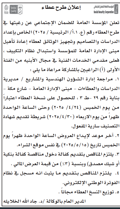 عطاء صادر عن المؤسسة العامة للضمان الاجتماعي