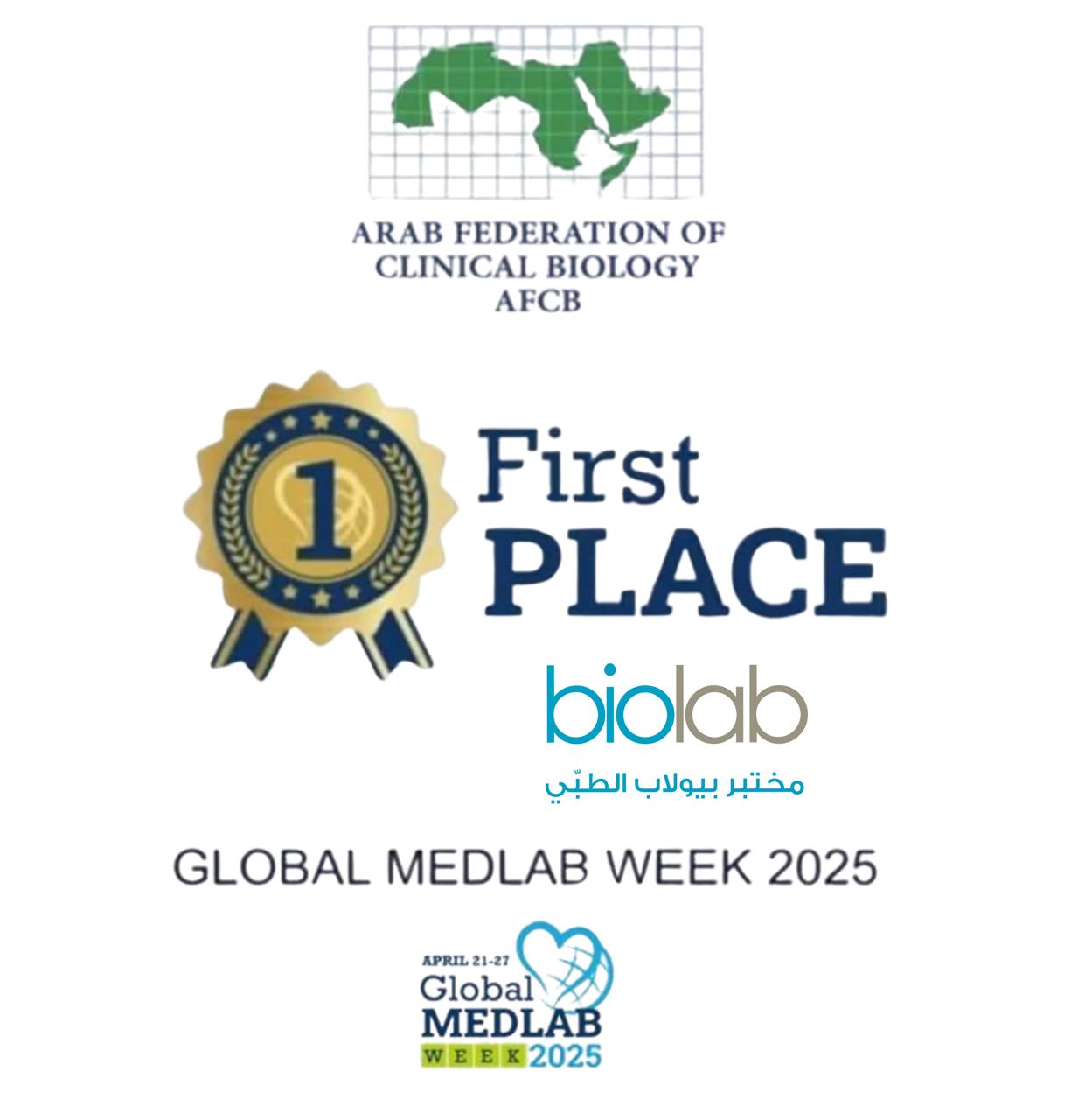 عمون - حصل مختبر بيولاب الطبي على المركز الأول عن فئة دول أعضاء الاتحاد العربي للبيولوجيا السريرية، وذلك ضمن المسابقة الدولية التي نظمها الاتحاد الدولي للكيمياء السريرية والطب المخبري (IFCC) لعام 2025، والتي جاءت تحت شعار: "المختبر ينقذ الحياة"، خلال فعاليات أسبوع المختبرات الطبية العالمي.
