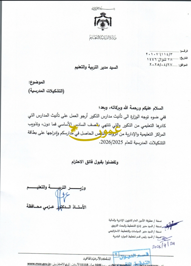 التربية تبدأ بتأنيث مدارس الذكور المنتهية بالصف السادس27-04-2025 11:53 AM