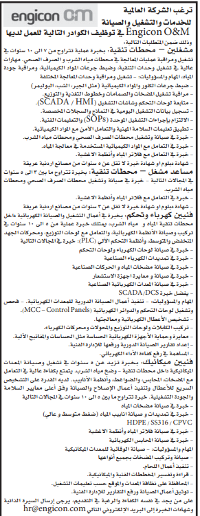 وظائف شاغرة لدى الشركة العالمية للخدمات والتشغيل والصيانة Engicon O&M