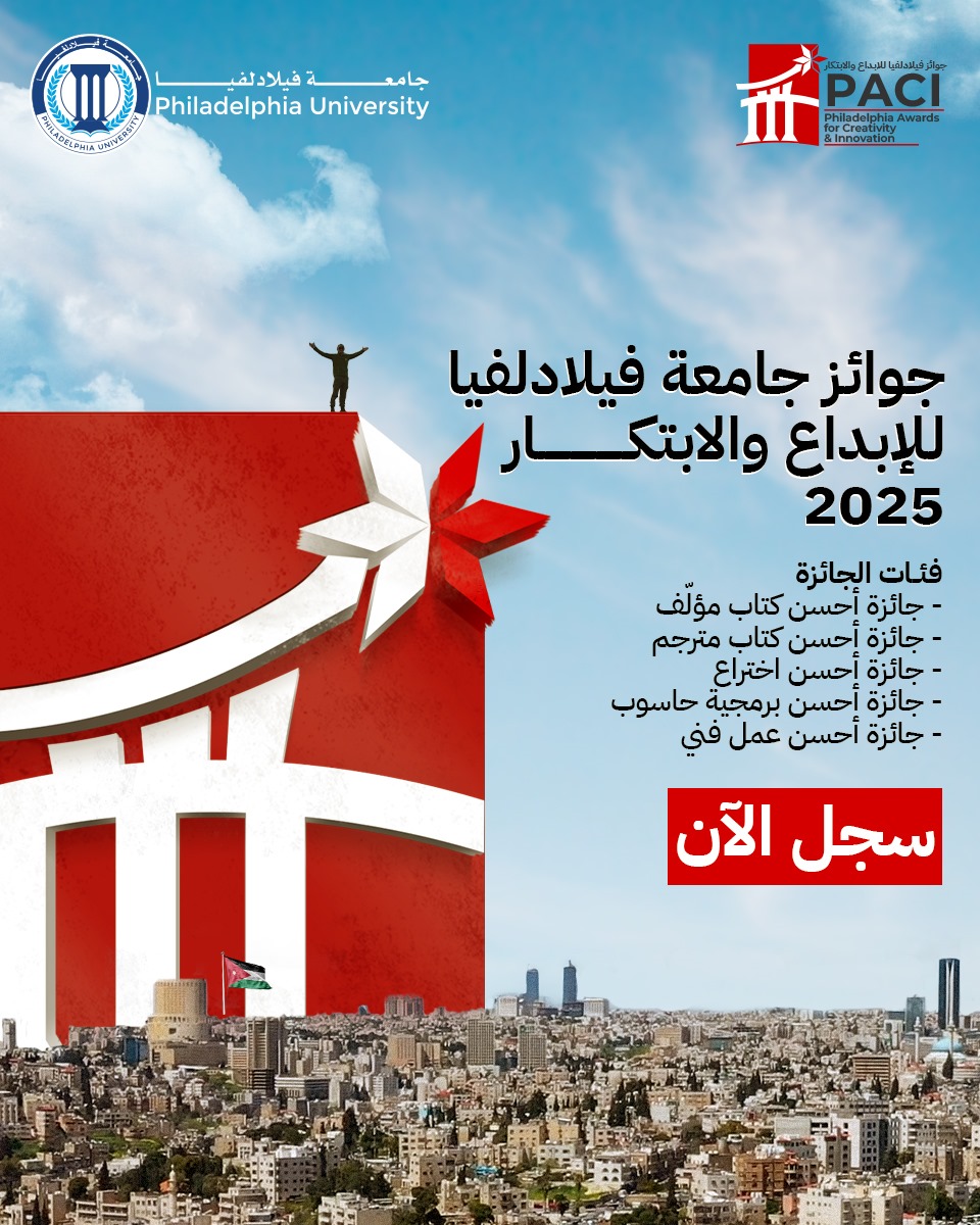 عمون - في خطوة تهدف إلى تعزيز المشهد الثقافي والعلمي والتقني في الأردن، وتشجيعًا للمبدعين على تقديم أعمالهم الفريدة التي تساهم في إحداث تأثير إيجابي في جميع المجالات، أعلنت جامعة فيلادلفيا عن إطلاق دورة جديدة من جوائز جامعة فيلادلفيا للإبداع والابتكار لعام 2025، والتي تهدف إلى تكريم المبدعين والمؤلفين والمخترعين الأردنيين في مختلف المجالات، بما في ذلك الكتابة، والترجمة، والاختراعات، والبرمجيات، والفنون، وتشمل الجوائز عدة مجالات، ومنها: جائزة أحسن كتاب مؤلف، جائزة أحسن كتاب مترجم، جائزة أحسن اختراع، جائزة أحسن برمجية حاسوب، وجائزة أحسن عمل فني.