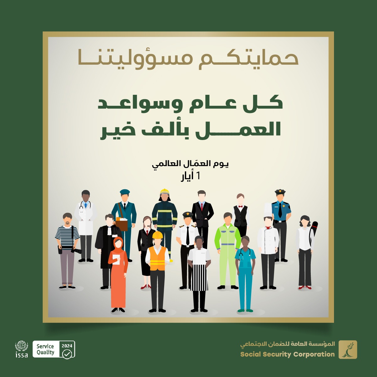 ووجهت المؤسسة تحية تقدير واعتزاز لكافة العمَّال على أرض المملكة بمناسبة يوم العمّال العالمي الذي يُصادف في الأول من شهر أيار من كل عام، مؤكدةً على ضرورة أن يحظى كافة العاملين على أرض المملكة على اختلاف جنسهم أو جنسيتهم بالحماية الاجتماعية وتوفير بيئة عمل آمنة لهم كون الضمان الاجتماعي هو الملاذ الآمن لهم وركيزة أساسية من ركائز الحماية الاجتماعية يوفر أمن الدخل للإنسان العامل وأسرته عند إكماله سن الشيخوخة أو عند توفر شروط استحقاق رواتب العجز أو الوفاة أو التعطل المؤقت عن العمل أو بدل الأمومة، وحمايته عند التعرض لحوادث وإصابات العمل.