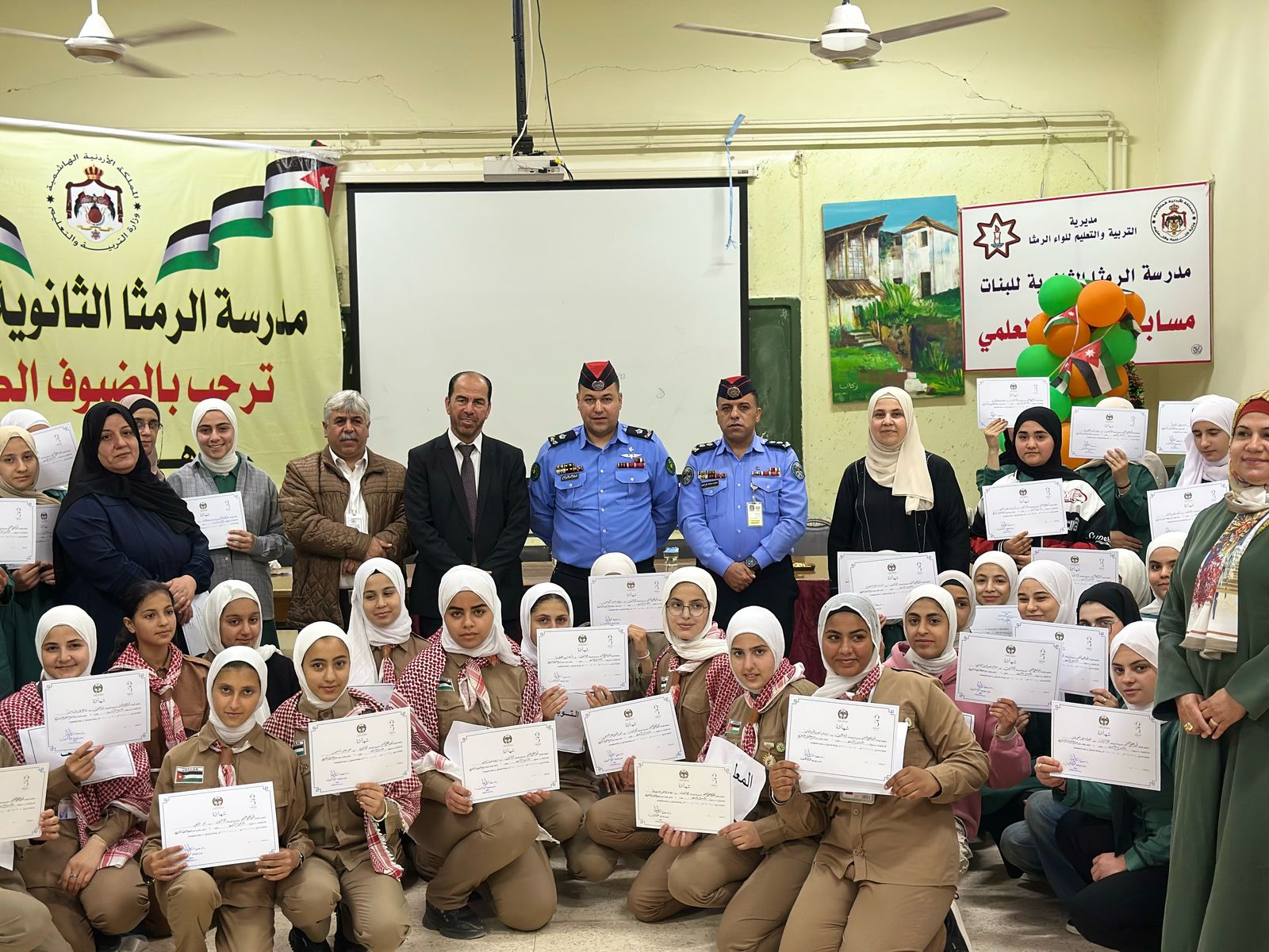 عمون - رعى مدير التربية والتعليم للواء الرمثا، الدكتور فيصل الحوامدة، فعاليات تخريج برنامج الأسر الآمنة لطالبات الصف العاشر والثامن ، في مدرسة الرمثا الثانوية للبنات، بحضور رئيس مركز أمن المدينة الرائد ورد وشاح ومن الشرطة المجتمعية الملازم اول حمزة الذيابات. |