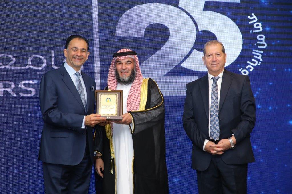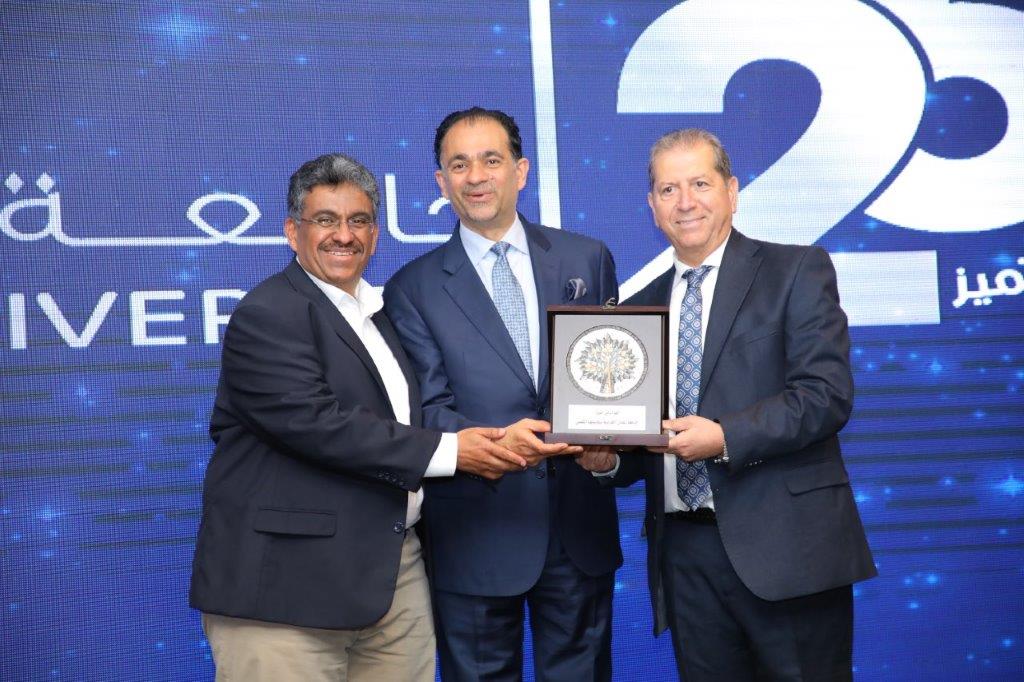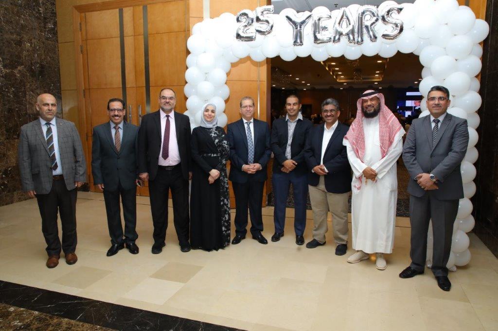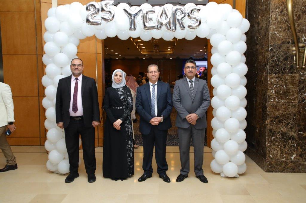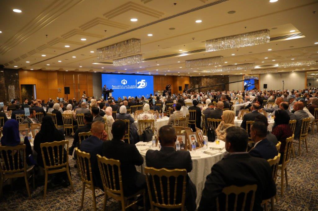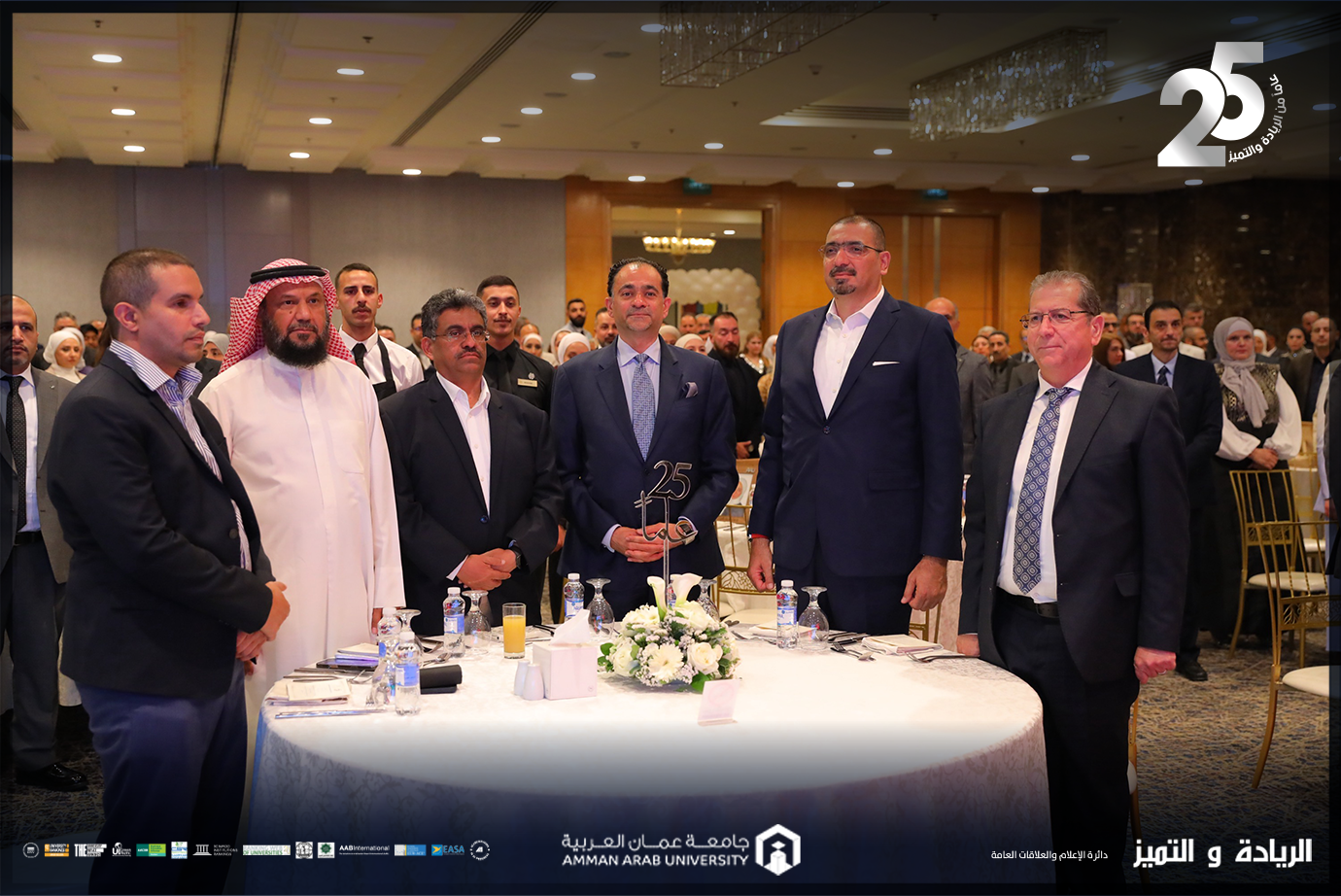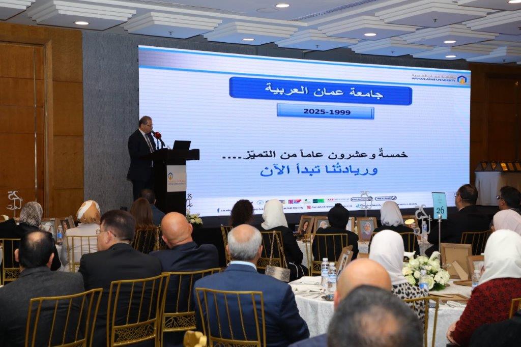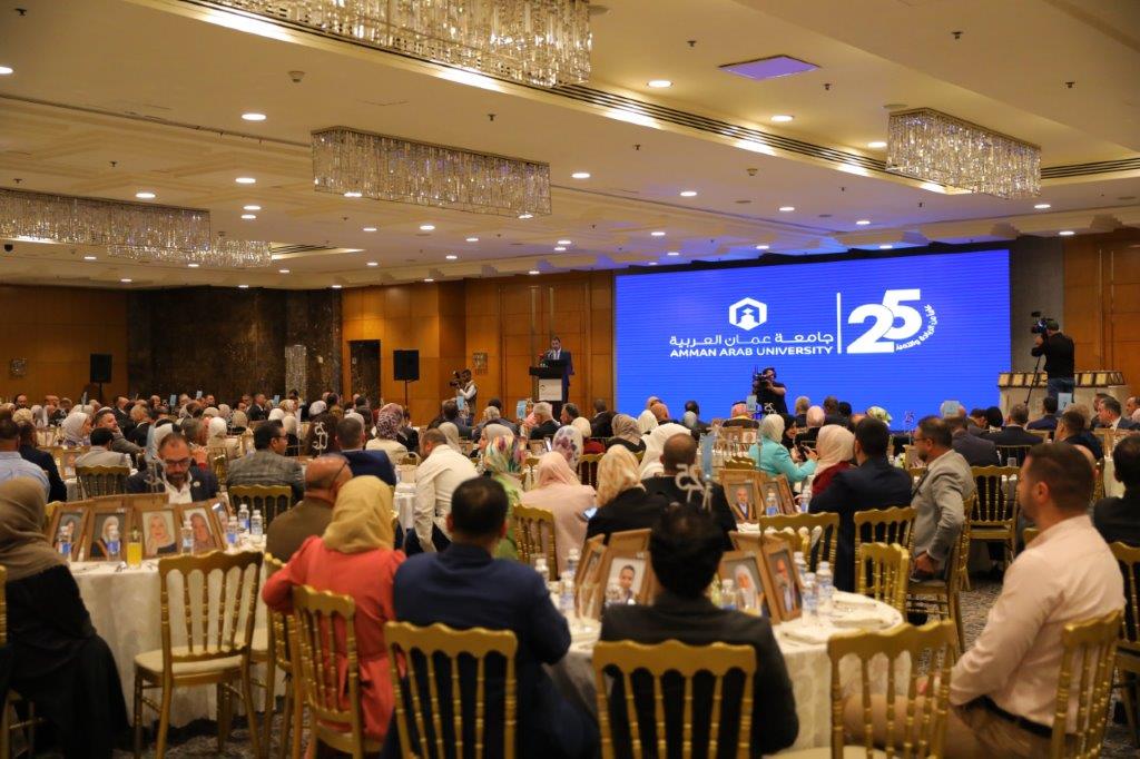 عمون - في مشهدٍ احتفاليّ يعبّر عن روح الانتماء والاعتزاز ويُجسّد عمق العلاقة بين الجامعة وكوادرها التي أسهمت في مسيرة إنجازاتها عبر ربع قرن من الزمن ، احتفلت جامعة عمان العربية بمرور خمسة وعشرين عامًا على تأسيسها، في أمسية رائعة تزينت بالعِلم والفخر وذلك تحت رعاية سعادة الدكتور عمر مشهور حديثة الجازي رئيس مجلس أمناء الجامعة ، وبحضور كلّ من: معالي الدكتور إبراهيم الجازي، والمهندس أحمد الخالد رئيس هيئة المديرين، والأستاذ الدكتور محمد الوديان رئيس الجامعة، إلى جانب أعضاء مجلس الأمناء، ومساعدي الرئيس، وعمداء الكليات، ومدراء المراكز والمكاتب والوحدات الإدارية، وأعضاء الهيئتين التدريسية والإدارية في الجامعة، في فندق شيراتون – عمّان.