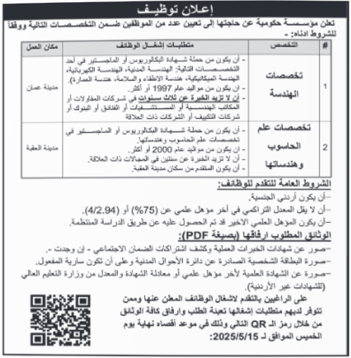 عمون- أعلنت عدد من المؤسسات الرسمية، اليوم الأحد، عن حاجتها لتعبئة وظائف شاغرة، فيما دعت أخرى عددًا من المرشحين لإجراء المقابلات الشخصية.