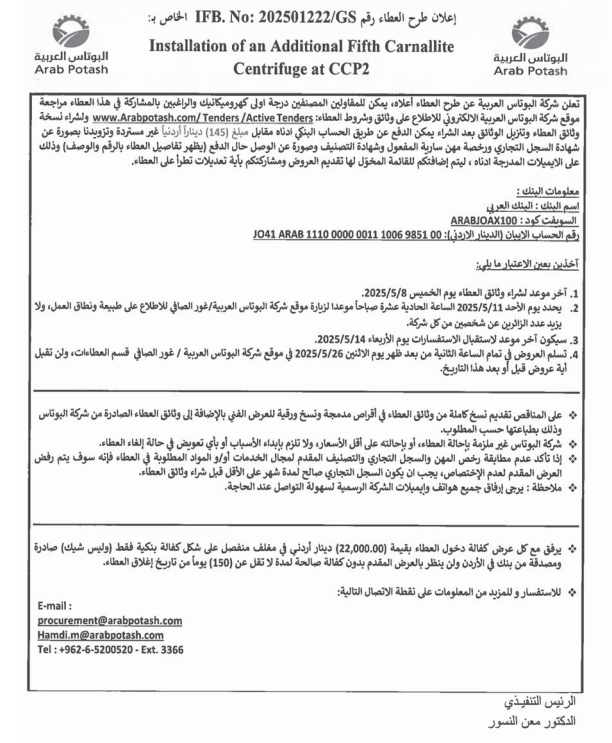 عطاء صادر عن شركة البوتاس العربية