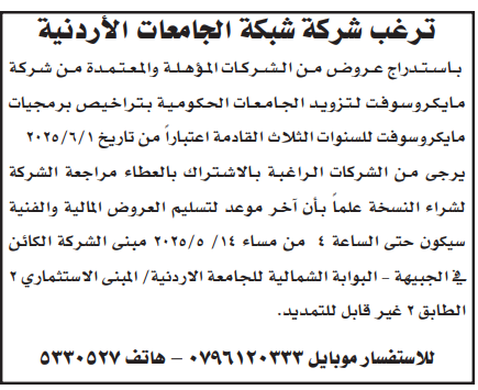 عطاء تراخيص برمجيات مايكروسوفت لشبكة الجامعات الاردنية
