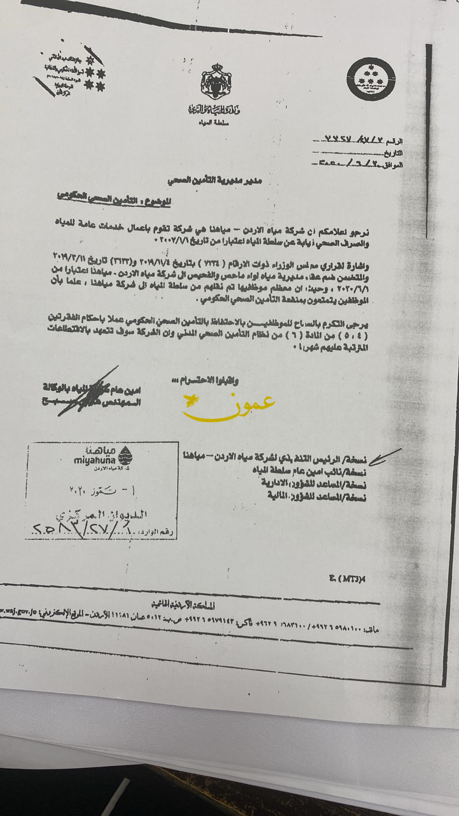 عمون - شكا موظفو شركة "مياهنا – فرع البلقاء" المعارين والمنقولين من سلطة المياه، من مشكلة تأخر وعدم تجديد بطاقات التأمين الصحي الخاصة بهم، والتي انتهت صلاحيتها في الأول من نيسان الماضي.