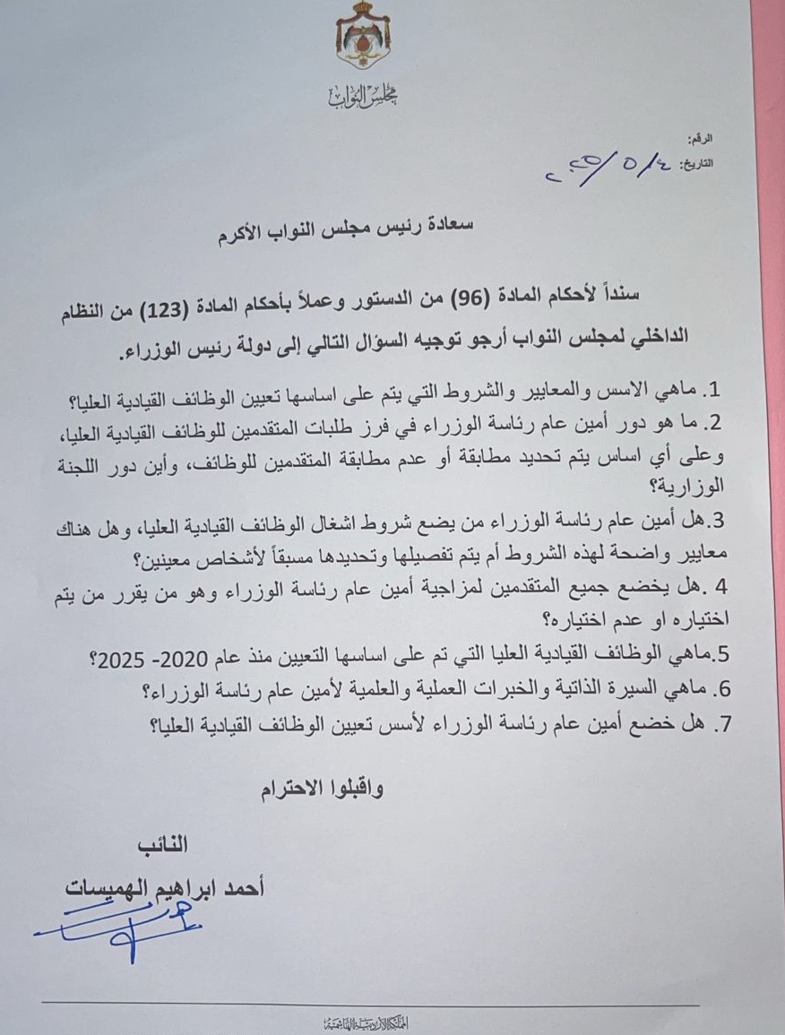 عمون - وجه النائب أحمد الهميسات سؤالًا نيابيًا لرئيس الوزراء للاستفسار عن الأسس والمعايير المعتمدة في تعيين شاغلي الوظائف القيادية العليا في مؤسسات الدولة.