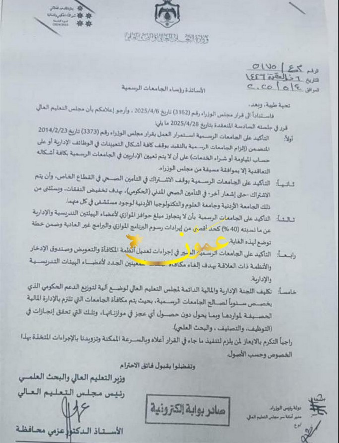 محافظة يعمم على الجامعات الرسمية: استمرار وقف التعيينات